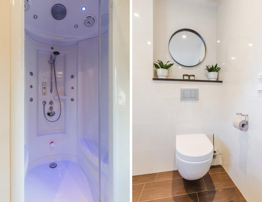 • Ligbad en luxe douchestoomcabine met licht en geur therapie. De badkamer is voorzien van vloerverwarming