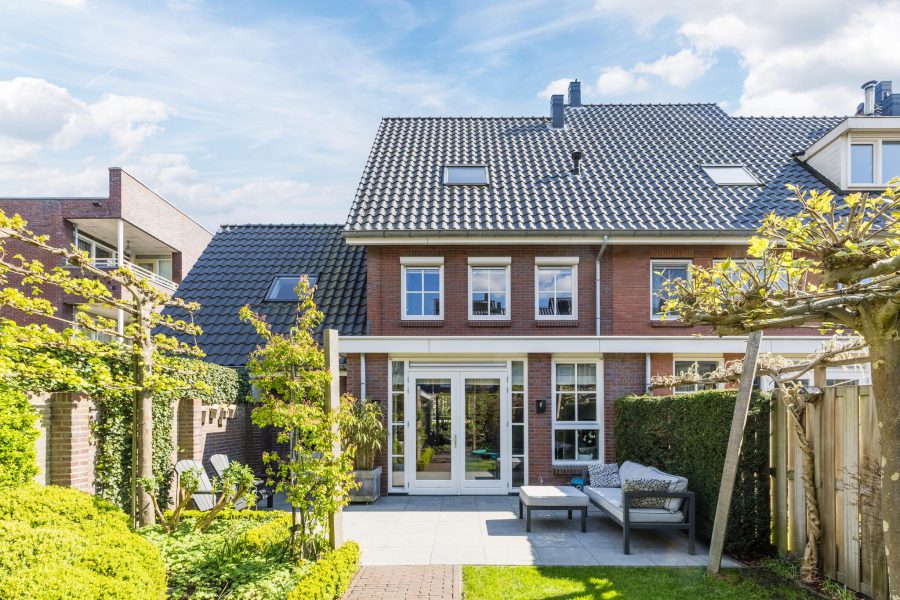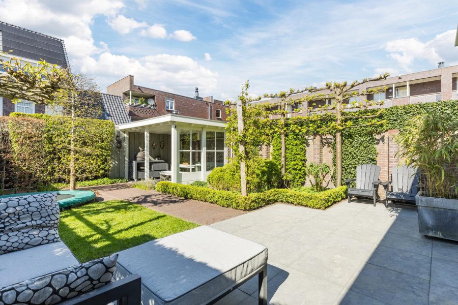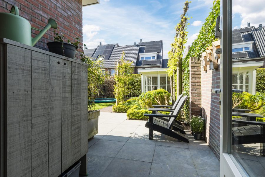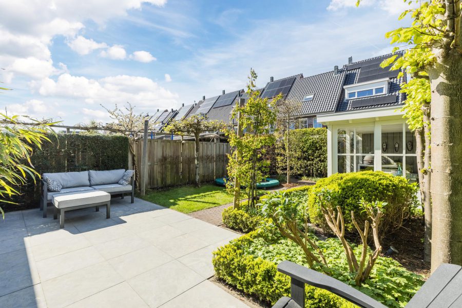 The house has a beautifully landscaped front garden and an equally beautifully landscaped, sheltered, partly green, partly tiled backyard. Adjacent to the house is a large terrace and at the back of the garden is a canopy where you can also create a lovely lounge area. Thanks to its corner location, you have a lot of privacy here. In the summer months, you can enjoy your meals outside with family and friends and children have plenty of room to play. There is a back entrance.