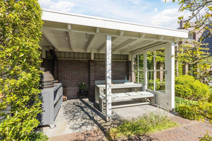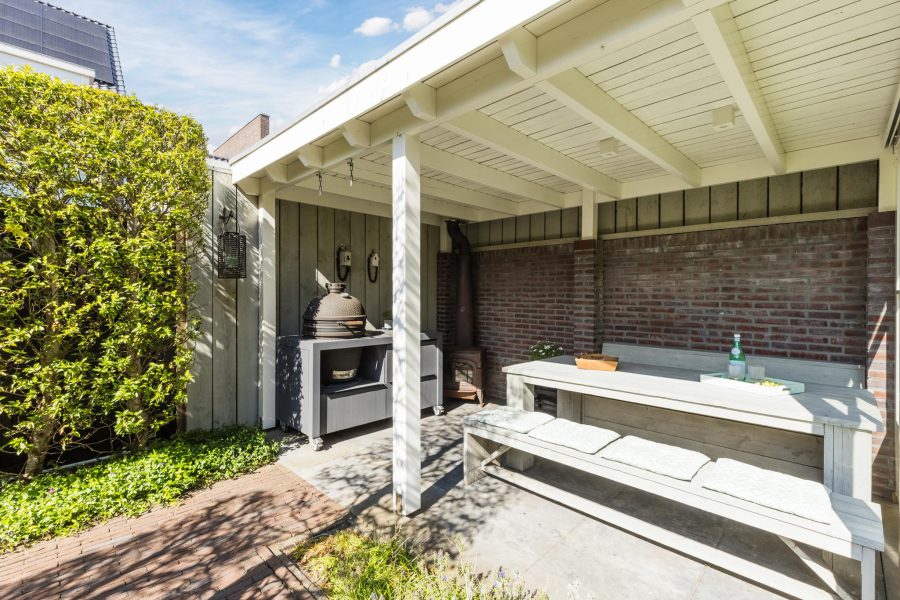 De woning heeft een fraai aangelegde voortuin en een eveneens fraai aangelegde, beschutte, deels groene, deels betegelde achtertuin. Aansluitend aan de woning tref je een groot terras aan en achterin de tuin vind je een overkapping waar je eveneens een heerlijke loungeplek kunt realiseren. Je hebt hier, mede door de hoekligging, veel privacy. Je kunt hier in de zomermanden gezellig met familie en vrienden buiten eten en kinderen hebben hier alle ruimte om te spelen. Er is een achterom.