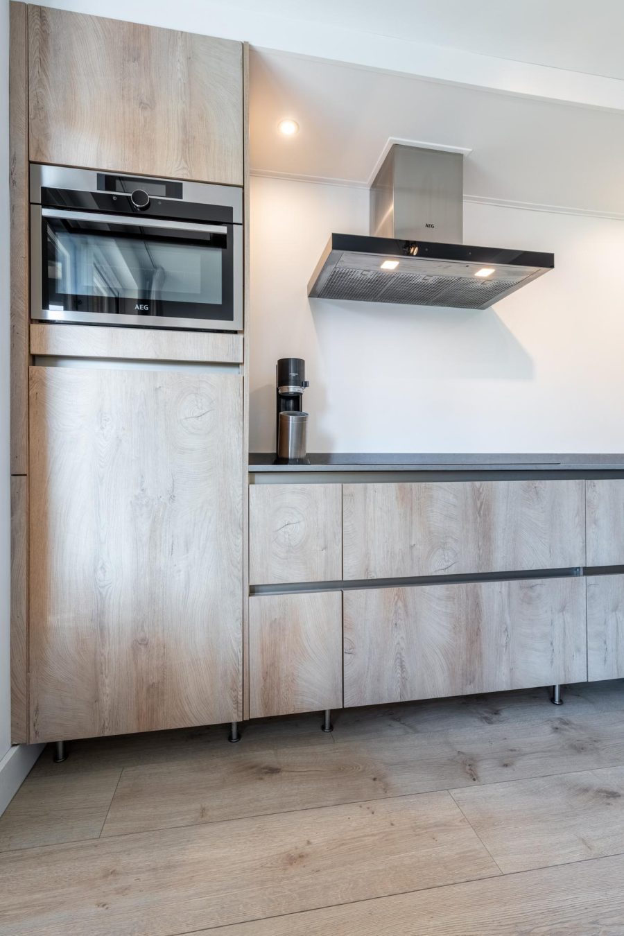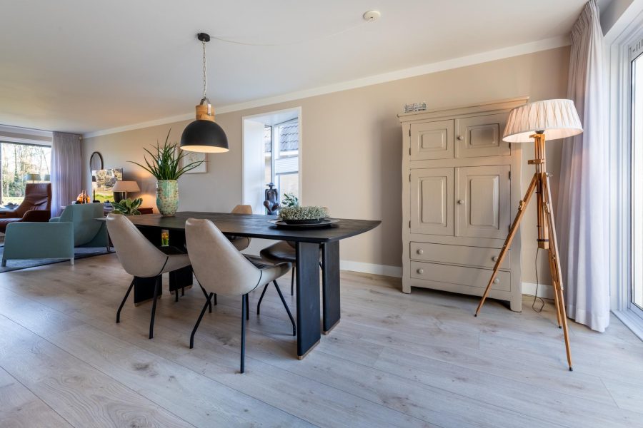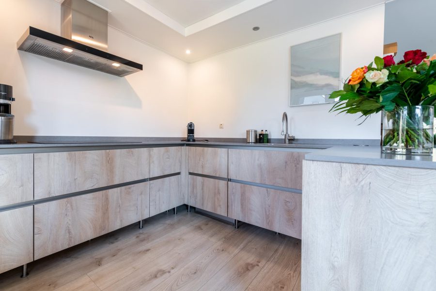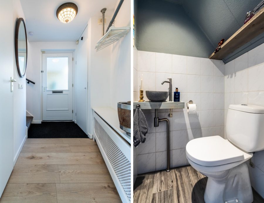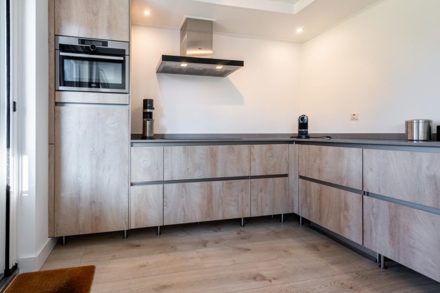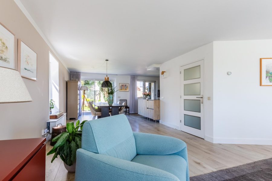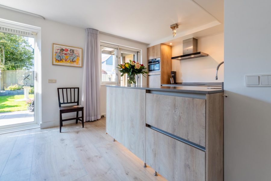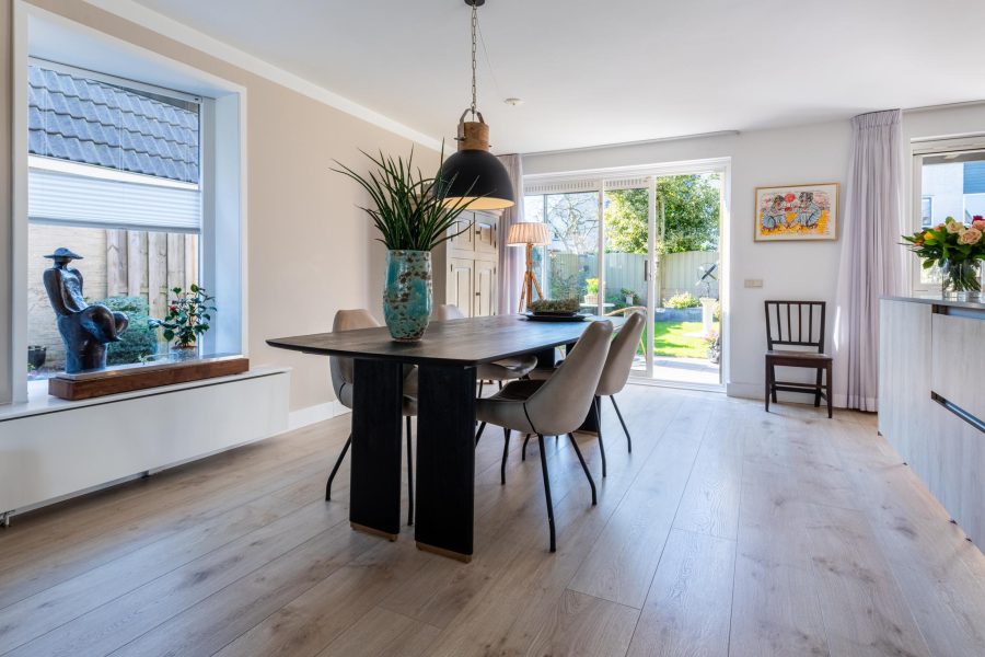 Through the beautifully landscaped front garden and private driveway, we reach the front door of the house. Entrance with meter closet and wardrobe, staircase to the first floor, standing toilet with hand basin and access to the living room with open kitchen. The bright, deep living room has two windows at the front. Here is room for a spacious seating area. At the rear you will find the modern, U-shaped kitchen (2019). The kitchen has wooden fronts and is equipped with various built-in appliances. You cook electric here. Near the kitchen is room for a six-seater dining table, with views of the garden. There is a side window near the kitchen and a sliding door giving access to the garden. The kitchen also has a door giving access to the garden. On the ground floor there are wooden floorboards and the walls and ceilings have a sleek and neutral finish.