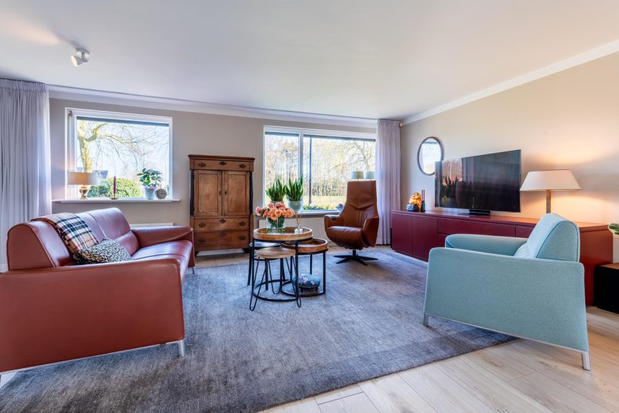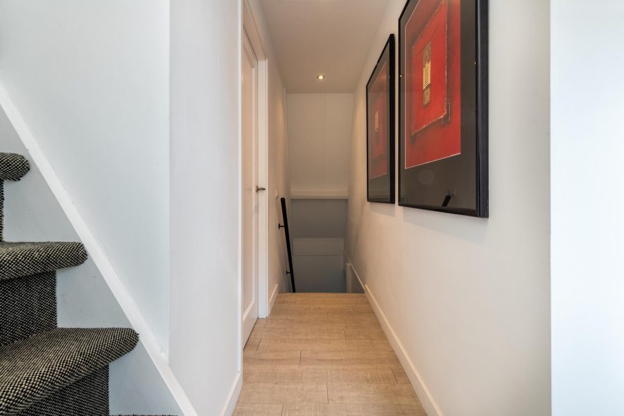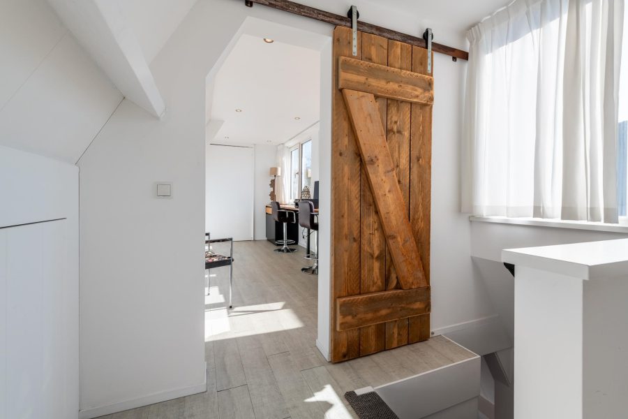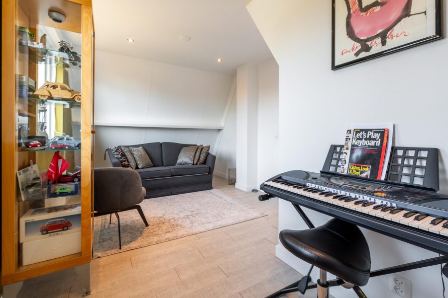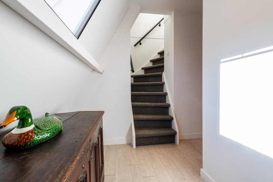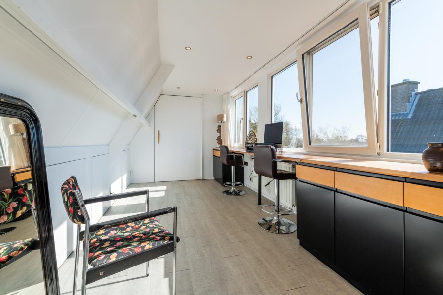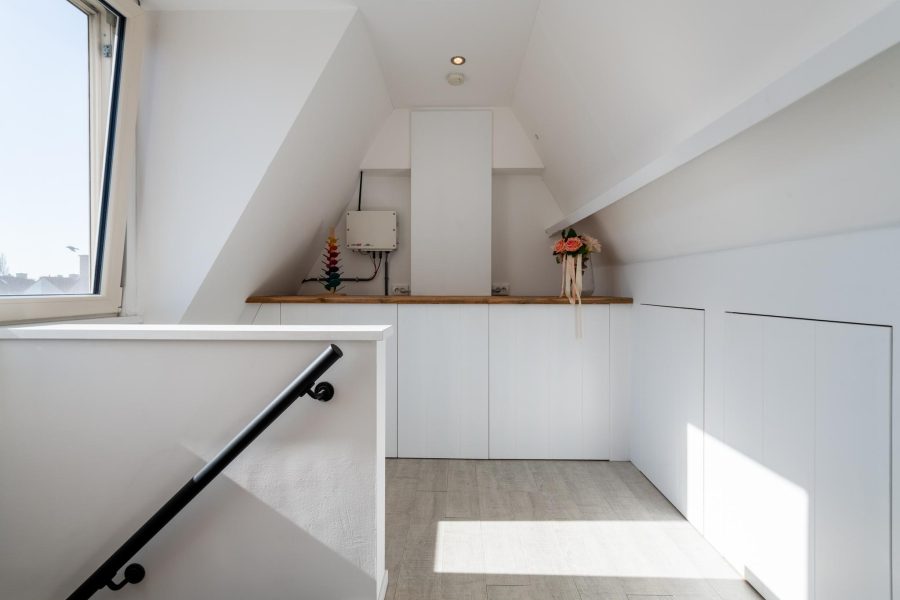Via the stairs we reach the landing of this floor. Here you will find two generous bedrooms and the bathroom. One bedroom is at the rear and the master bedroom is at the front. This room has fixed closets with sliding doors. Both bedrooms are nicely finished and have lovely light. The spacious, contemporary and cosy bathroom is located centrally on the floor. Here you will find a vanity unit with two washbasins and mirror, a bathtub, a floating toilet and a walk-in shower with handheld and rain shower. Your feet stay comfortably warm here thanks to underfloor heating.