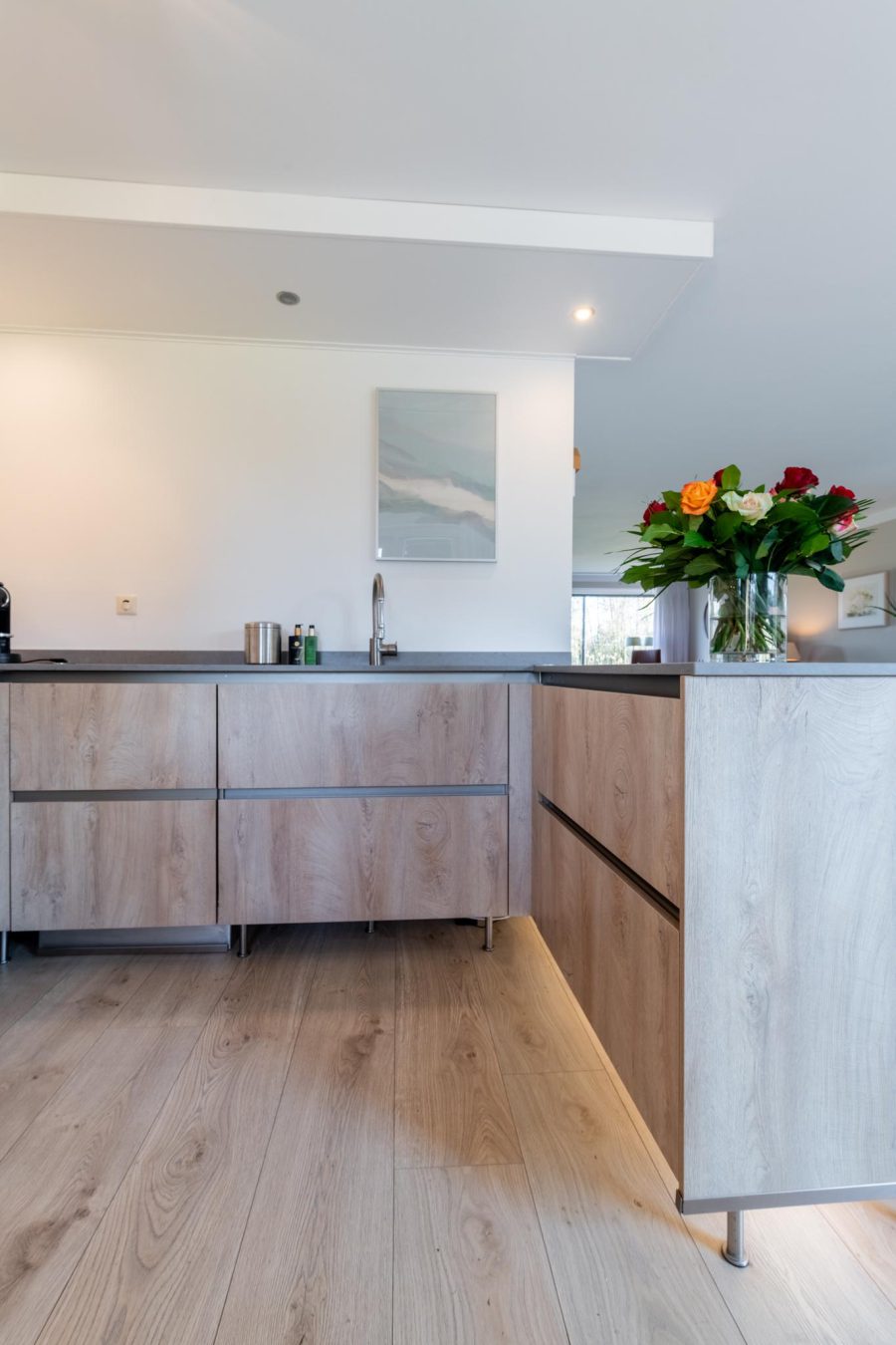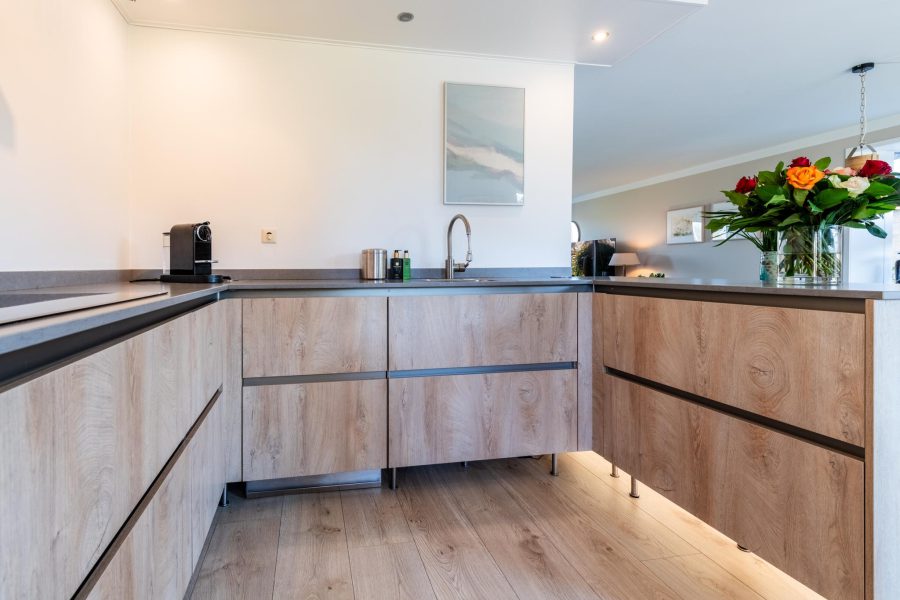 Via de fraai aangelegde voortuin en de eigen oprit bereiken we de voordeur van de woning. Entree met meterkast en garderobe, trapopgang naar de eerste verdieping, staand toilet met fonteintje en toegang tot de woonkamer met open keuken. De lichte, diepe woonkamer heeft aan de voorzijde twee raampartijen. Hier is plaats voor een ruime zithoek. Aan de achterzijde tref je de moderne, U-vormig keuken aan (2019). De keuken heeft een composiet aanrechtblad en is voorzien van diverse inbouwapparatuur. Je kookt hier elektrisch. In de buurt van de keuken is plaats voor een zespersoons eettafel, met uitzicht op de tuin. Ter hoogte van de keuken tref je een zijraam aan en via een schuifpui heb je toegang tot de tuin. In de keuken tref je ook een deur aan die eveneens toegang tot de tuin biedt. Op de begane grond liggen houten vloerdelen en de muren en plafonds zijn strak en neutraal afgewerkt.