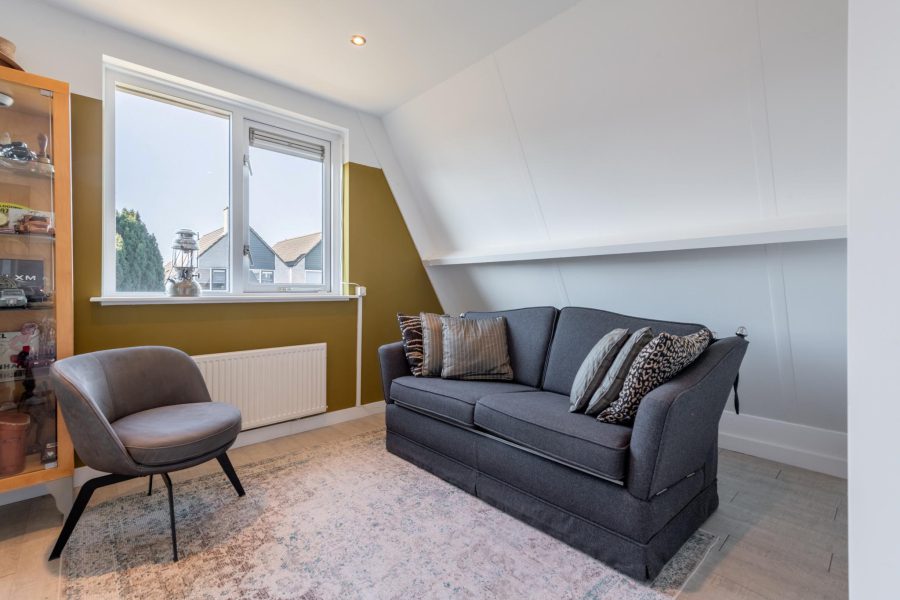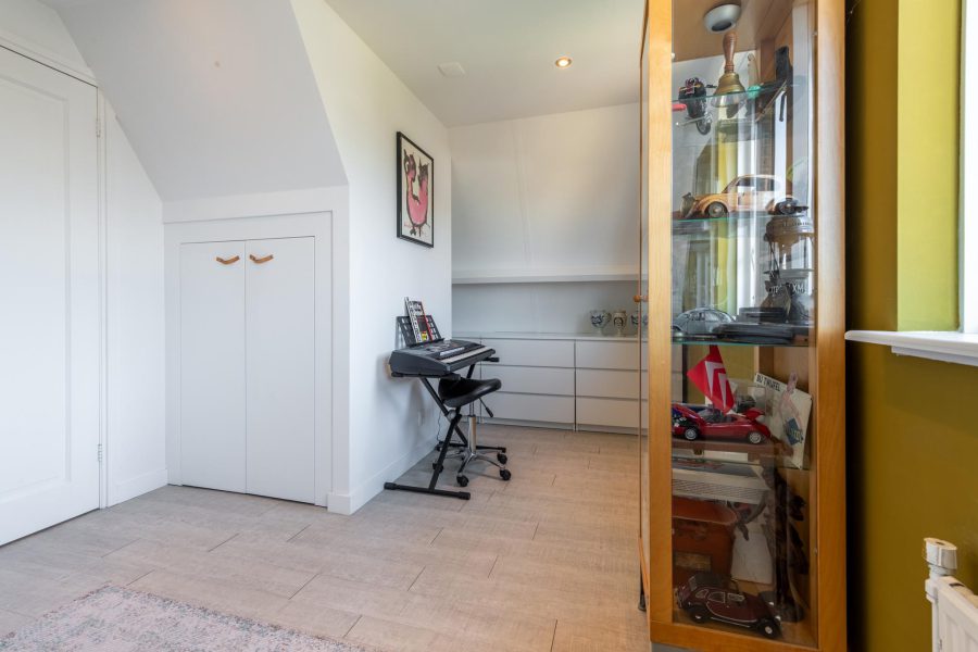 Hier is slaapkamer nummer drie te vinden. Deze slaapkamer is voorzien van een brede dakkapel. Ook deze verdieping is goed afgewerkt. Verder tref je hier veel (afgesloten) bergruimte aan.