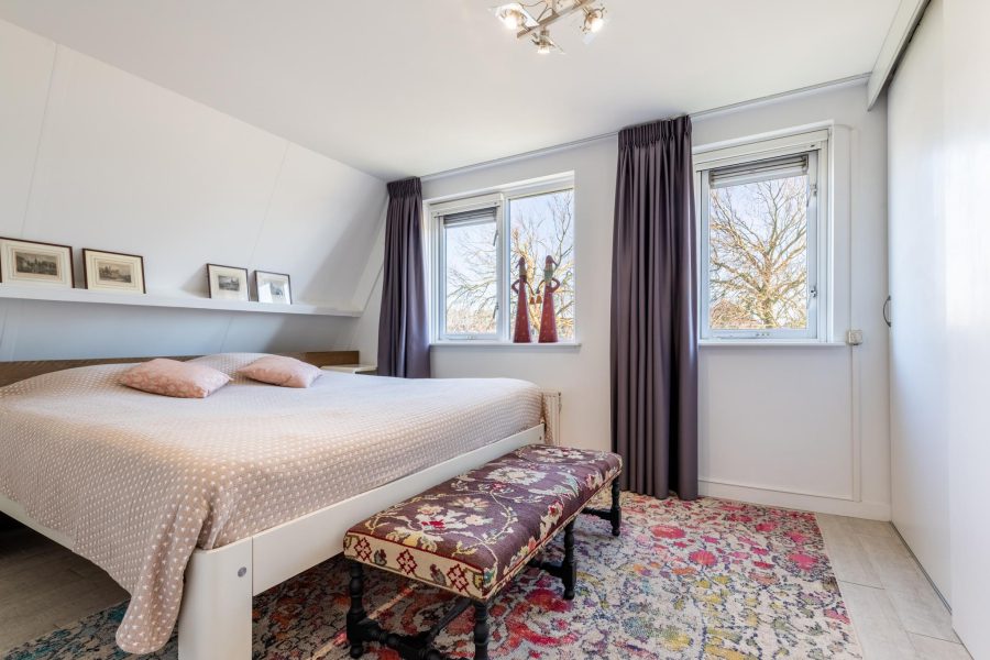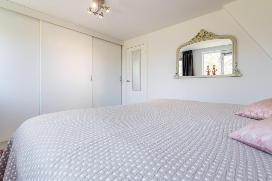 Via de trap bereiken we de overloop van deze verdieping. Hier zijn twee royale slaapkamers en de badkamer te vinden. Een slaapkamer ligt aan de achterzijde en de hoofdslaapkamer ligt aan de voorzijde. Deze kamer is voorzien van vaste kasten met schuifdeuren. Beide slaapkamers zijn keurig afgewerkt en hebben een mooie lichtinval. De ruime, eigentijdse en sfeervolle badkamer ligt centraal op de verdieping. Je treft hier een badmeubel met twee waskommen en spiegel, een ligbad, een zwevend toilet en een inloopdouche met hand- en regendouche aan. Je voeten blijven hier comfortabel warm door middel van vloerverwarming.