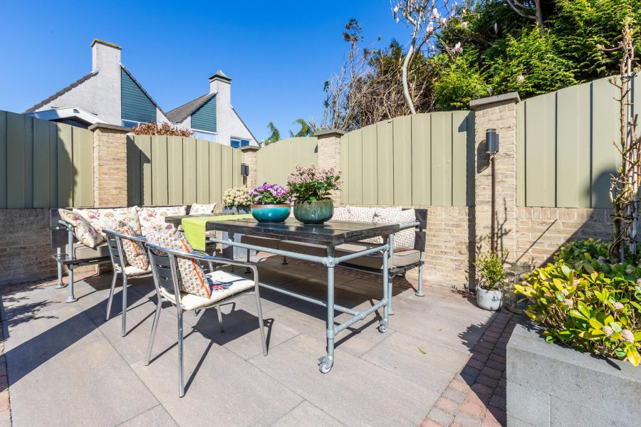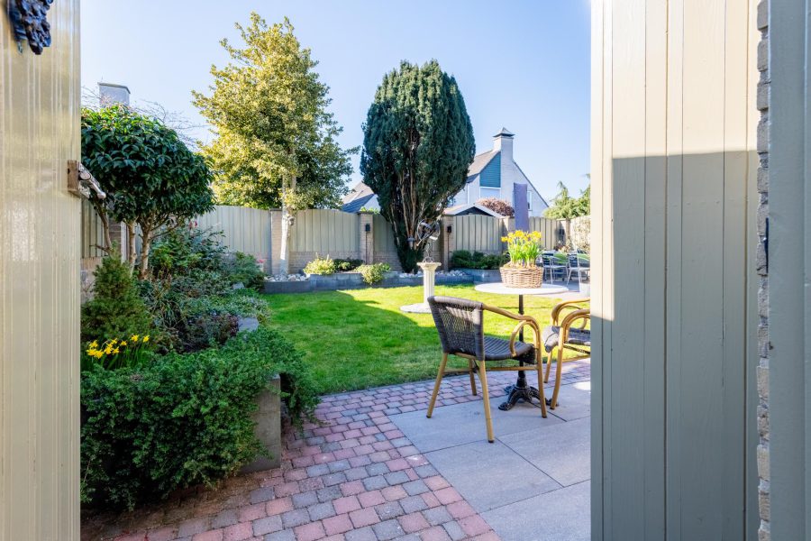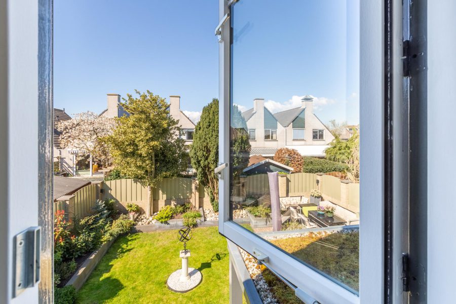 The house has a well-kept, partly playfully paved, partly green front, side and back garden. The garden is lovely and sunny, sheltered and very private. Attached to the house is a terrace with a canopy and a wooden shed. At the back of the garden is a second terrace where you can create a lovely lounge area and/or place a dining table outside to enjoy your meals during the summer months. On the lawn, children can play happily and safely.