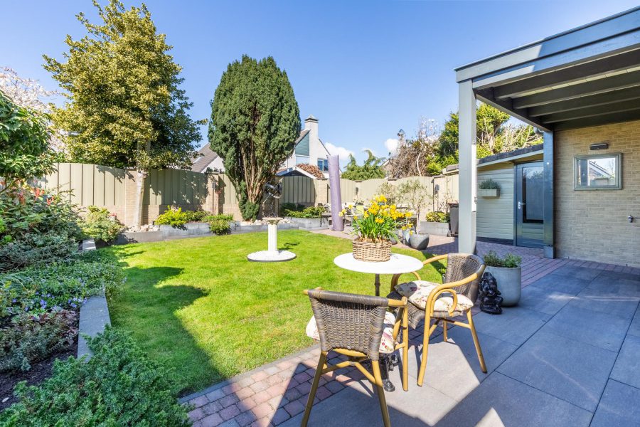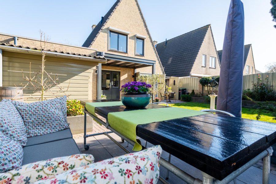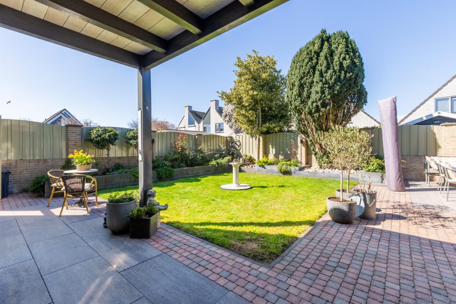 De woning heeft een goed verzorgde, deels speels bestrate, deels groene voor-, zij- en achtertuin. De tuin is heerlijk zonnig en beschut en kent veel privacy. Aan de woning vast tref je een terras met overkapping aan en een houten berging. Achterin de tuin vind je een tweede terras waar je een heerlijke loungeplek kunt realiseren en/of een eettafel buiten kunt plaatsen om in de zomermaanden gezellig buiten te eten. Op het grasveld kunnen kinderen heerlijk en veilig spelen.