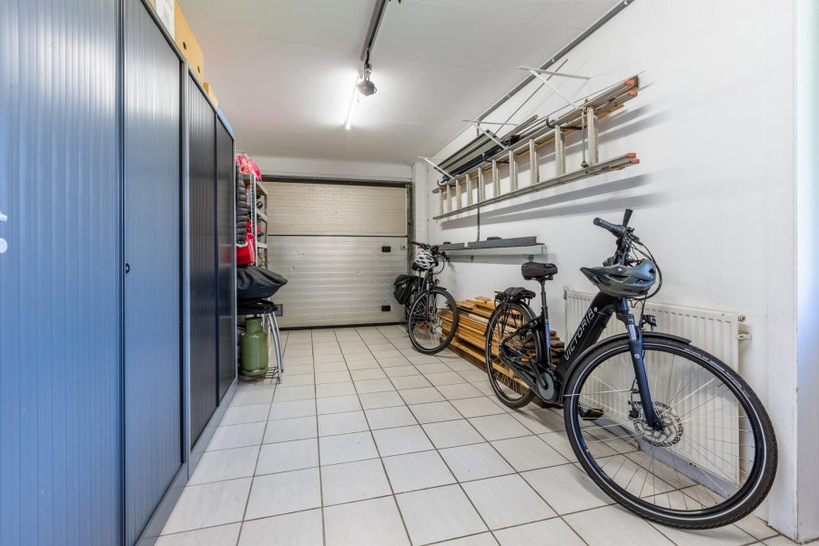 De woning heeft een garage met elektra en een toegangsdeur tot de tuin (achterom). In de garage tref je de aansluiting voor het witgoed aan.