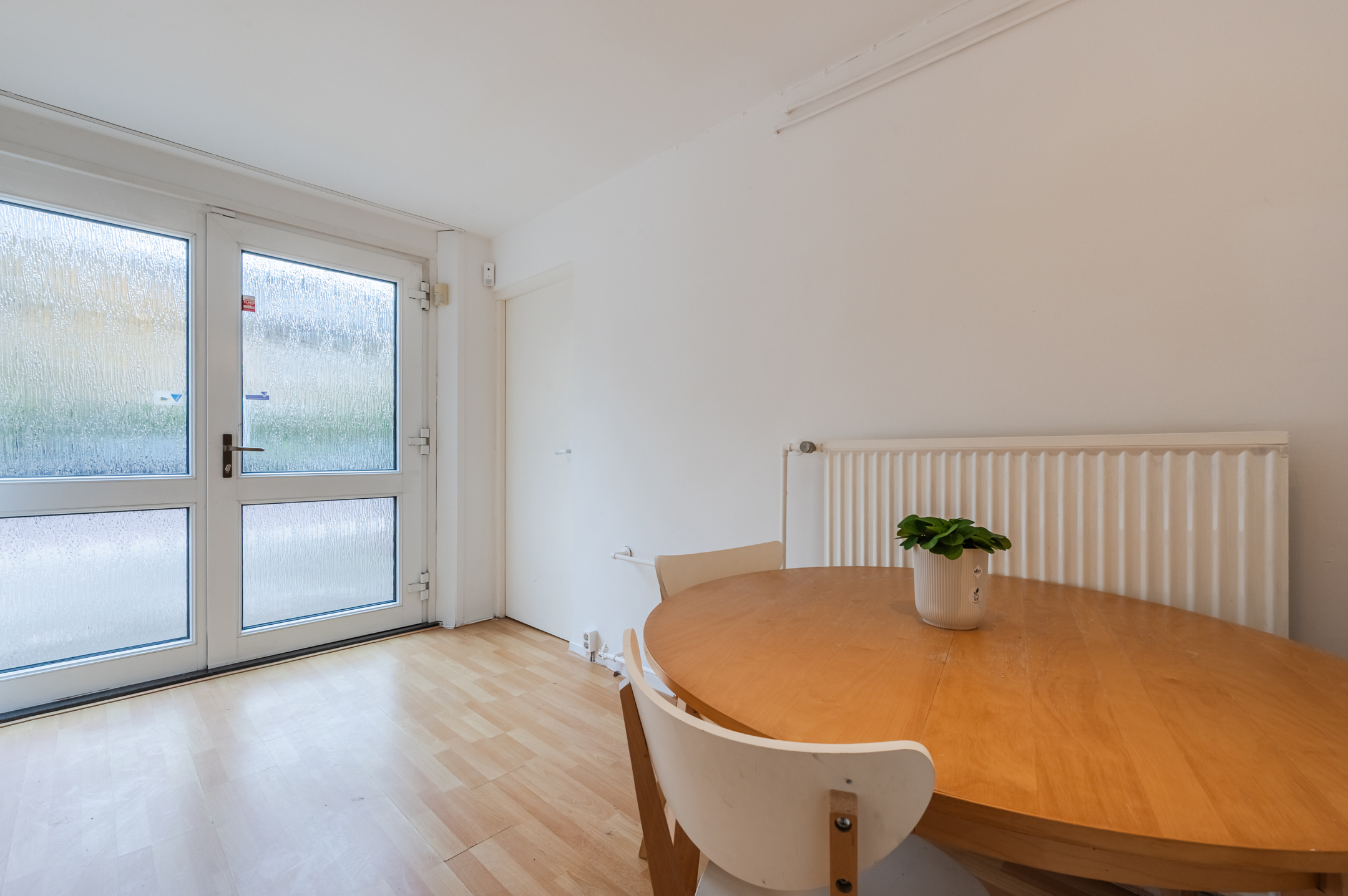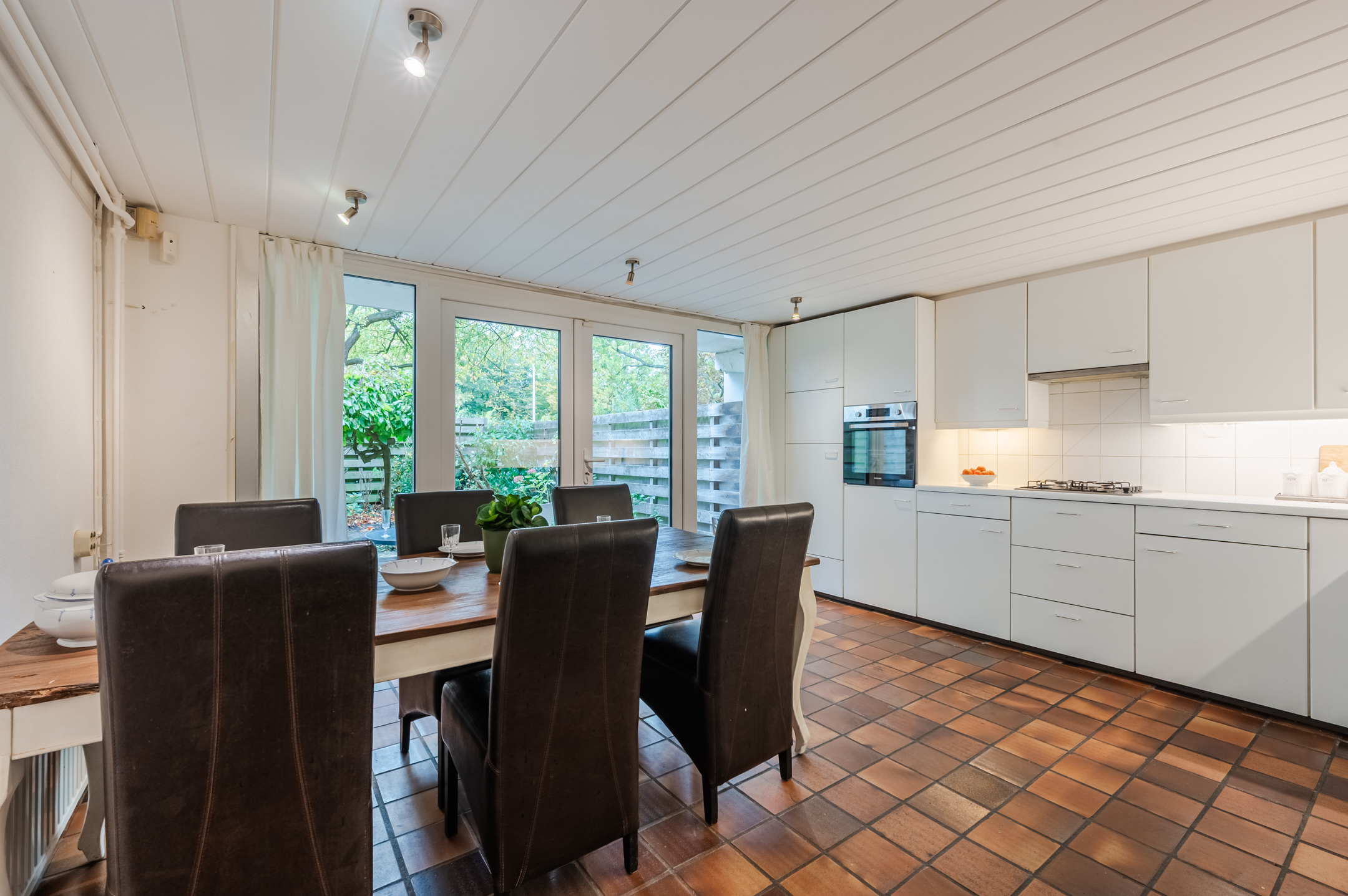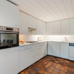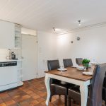 The spacious kitchen dates from but has been partially modernized with new appliances. The whole kitchen is corner-shaped and has a beautiful white design. Here you will find the following appliances: dishwasher, gas stove, oven , extractor hood and refrigerator. The kitchen has doors to the backyard.