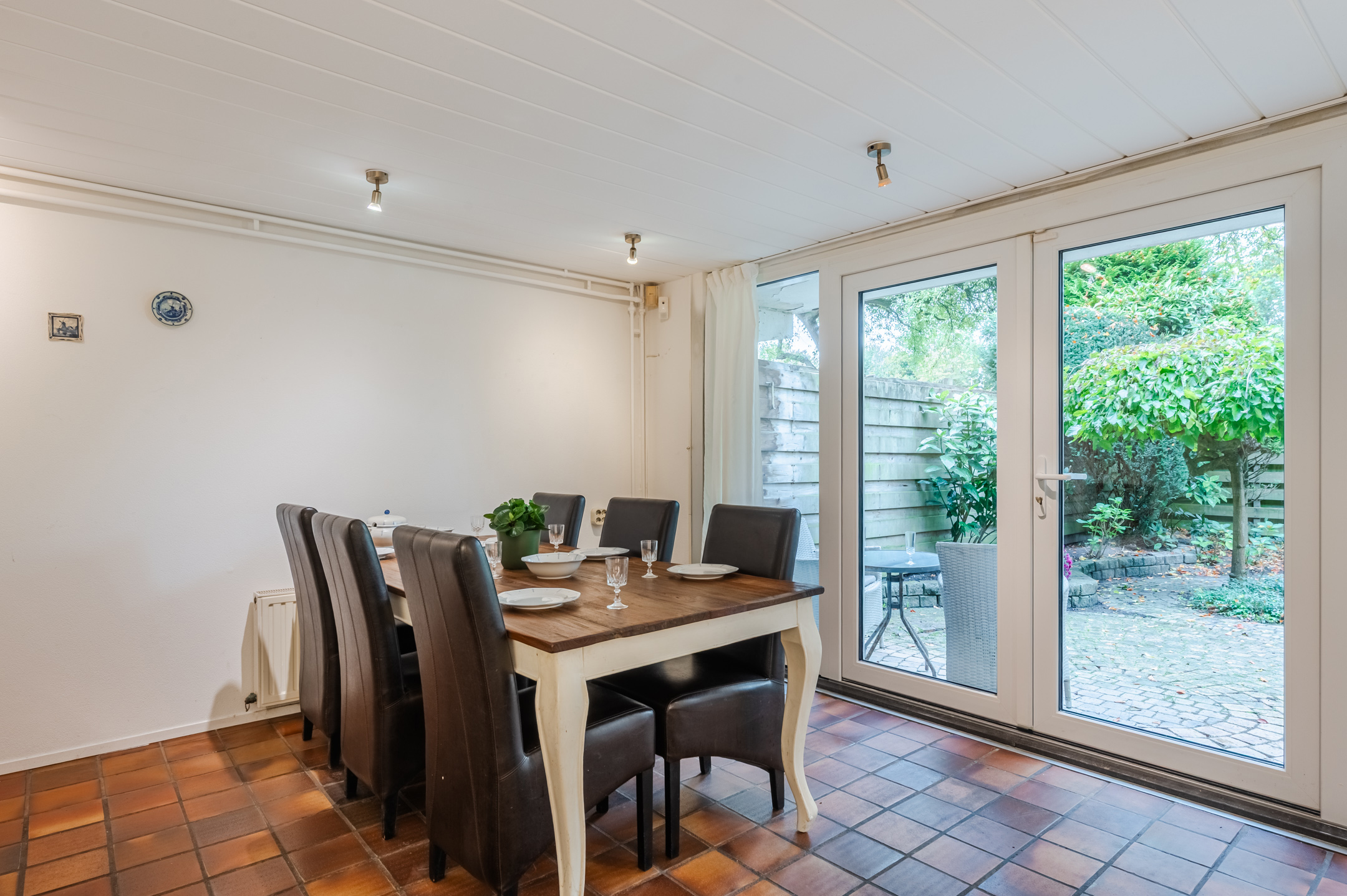 The house has a charming backyard, which is decorated with tiles, greenery and borders with plants. The garden has a nice terrace where you can set up a lovely lounge area. Part of the terrace is covered, so it is also possible to relax under cover. Thanks to the wooden fence around the yard, you can also enjoy plenty of privacy.