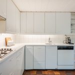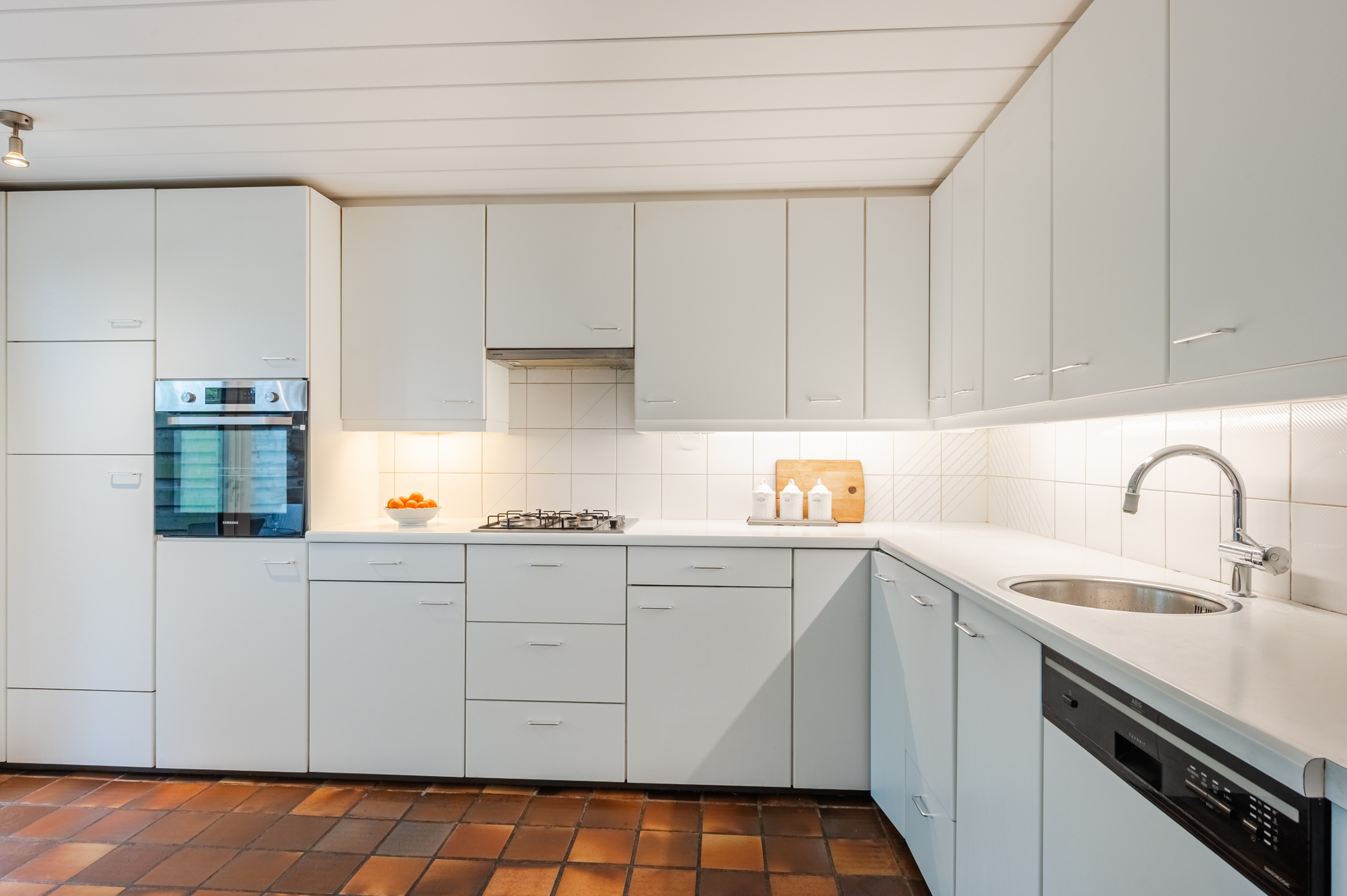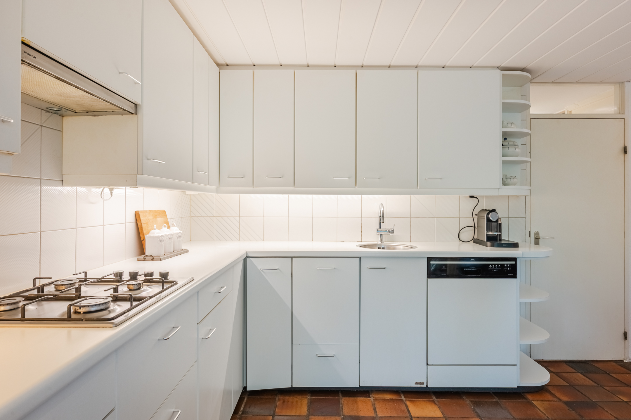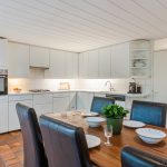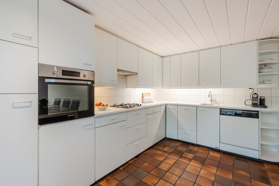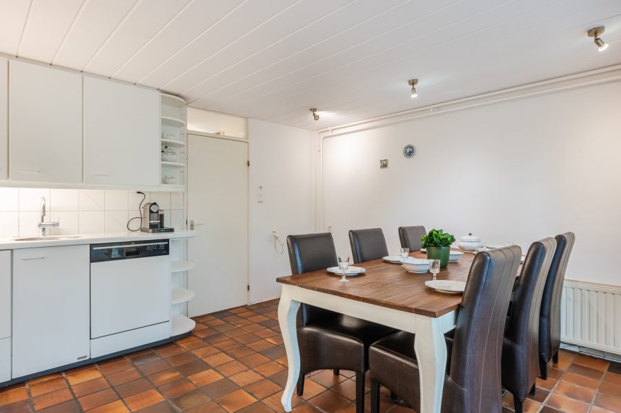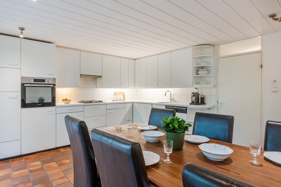 De ruim opgezette keuken, maar is deels gemoderniseerd met nieuwe apparatuur. Het geheel is uitgevoerd in een hoekopstelling en heeft een fraai, wit design. Hier tref je de volgende apparatuur aan: vaatwasser, gasfornuis, oven, afzuigkap en koelkast. De keukenruimte heeft openslaande deuren naar de achtertuin.