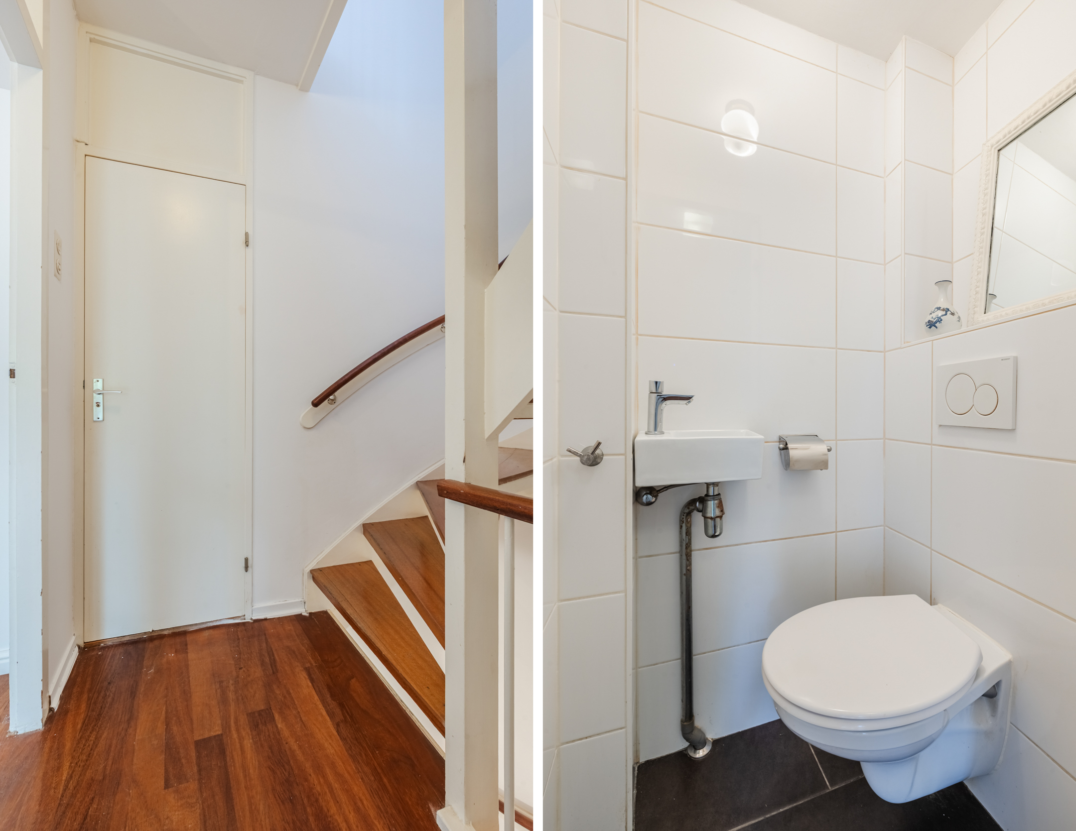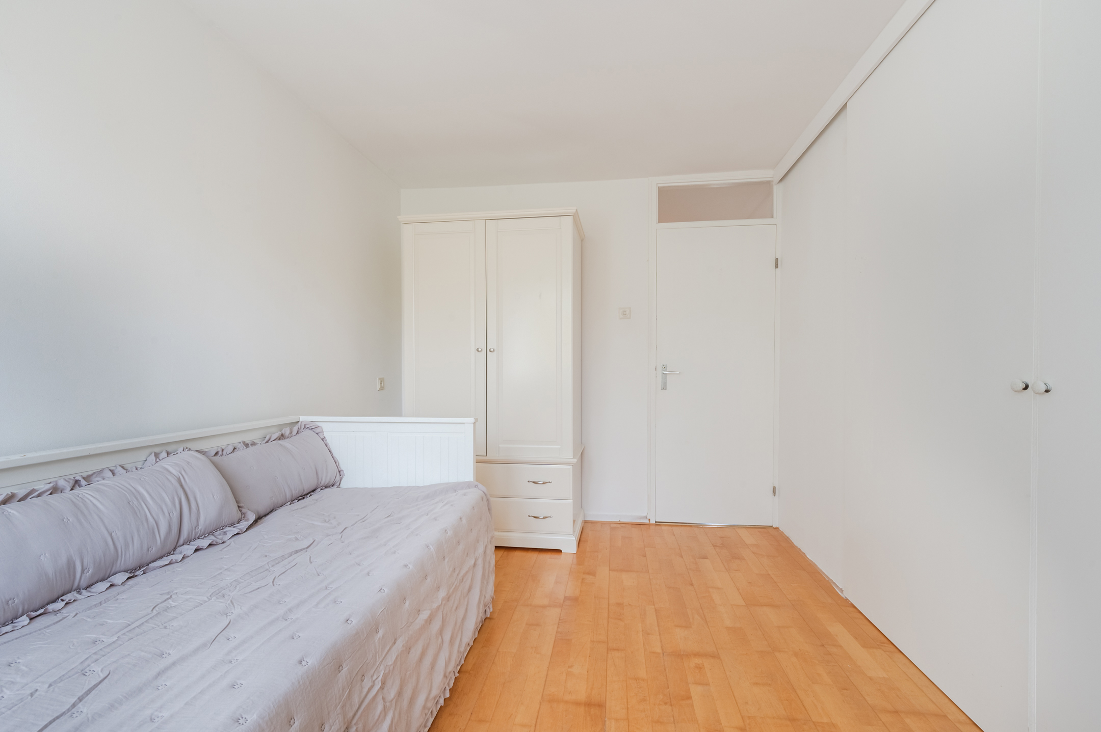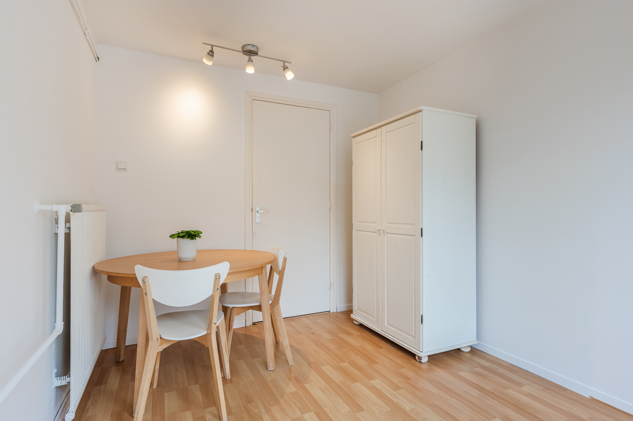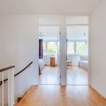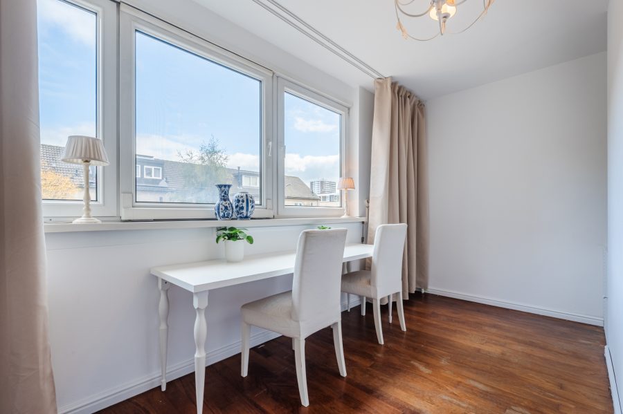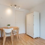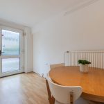 On this floor, you will find a toilet room with a floating toilet and washbasin, the living room and an office. The living room is spacious and finished with beautiful flooring and sleek walls. Thanks to the large window and door, this room enjoys wonderful natural light. From the living room, you can step right onto the balcony. There is space here for a small lounge area.