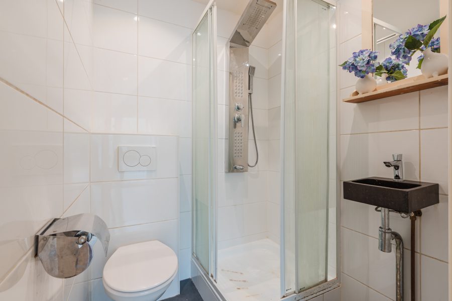 De zitkamer is voorzien van een nette vloer en keurig afgewerkte wanden. Aan de voorzijde heeft de kamer een grote raampartij, waardoor er veel natuurlijk licht binnen valt. Vanuit deze kamer is er toegang tot de eerste badkamer. Deze ruimte is afgewerkt met donkere vloertegels en witte wandtegels en uitgerust met een zwevend toilet, wastafel en douchecabine met luxe douchepaneel.