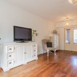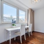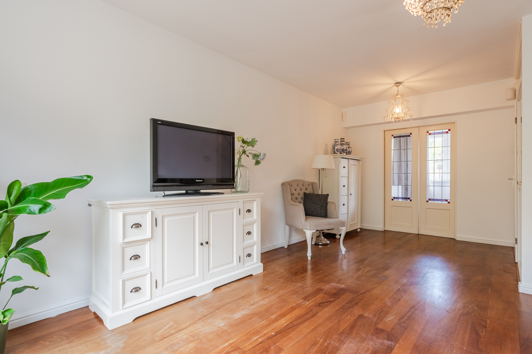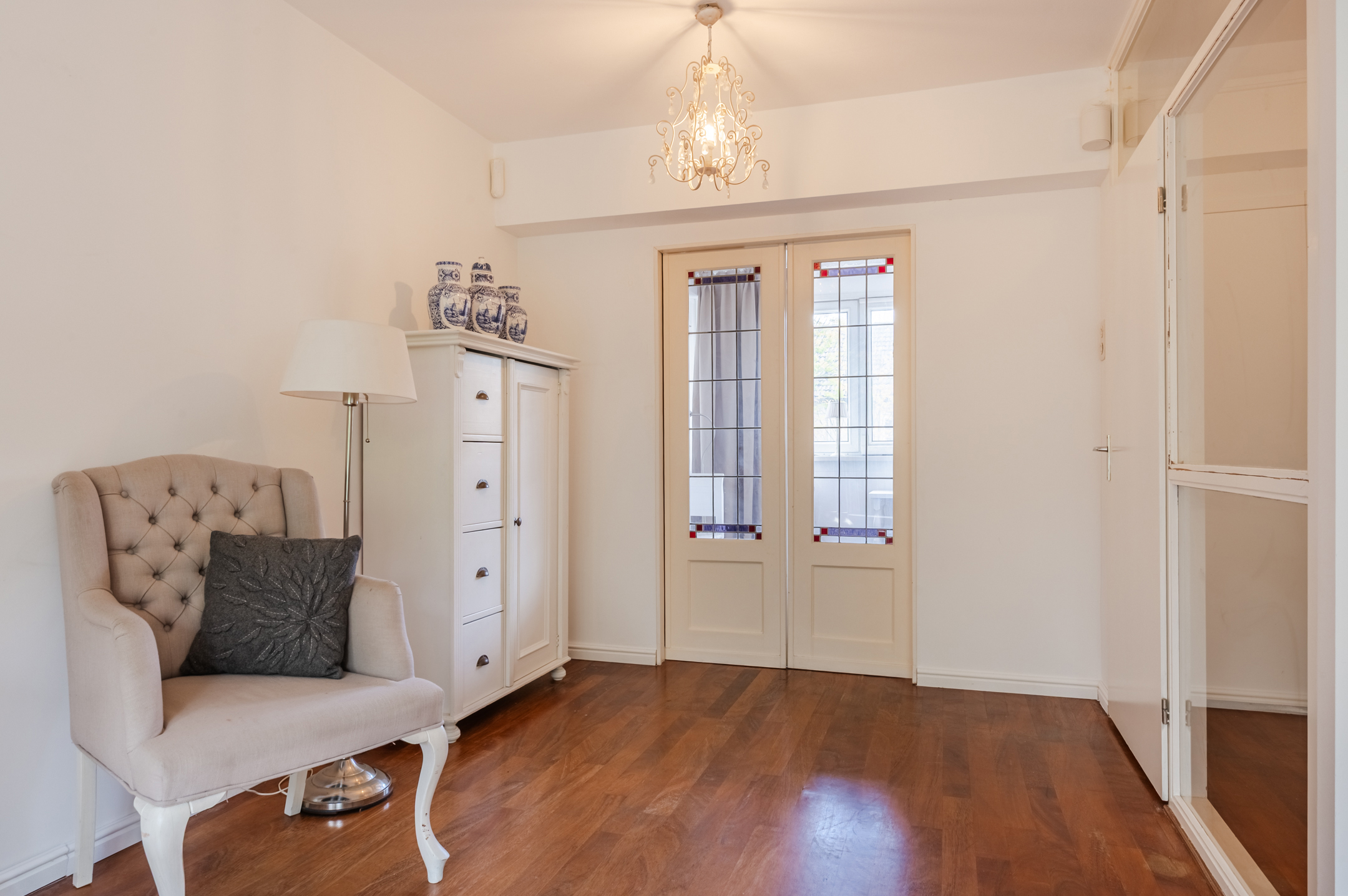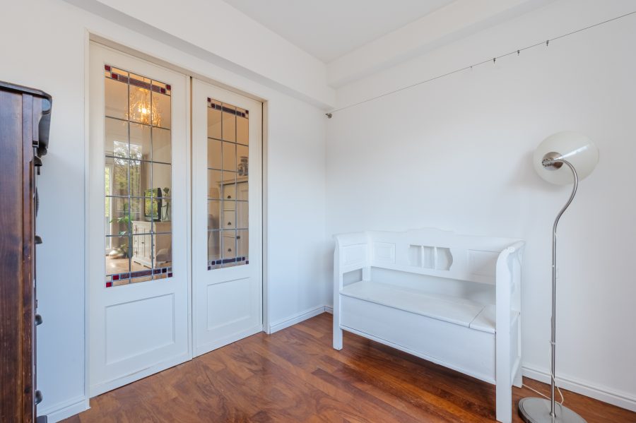 The living room offers access to the office through a sliding door with stained glass. In this space, you can work in peace. The large window provides pleasant natural light.