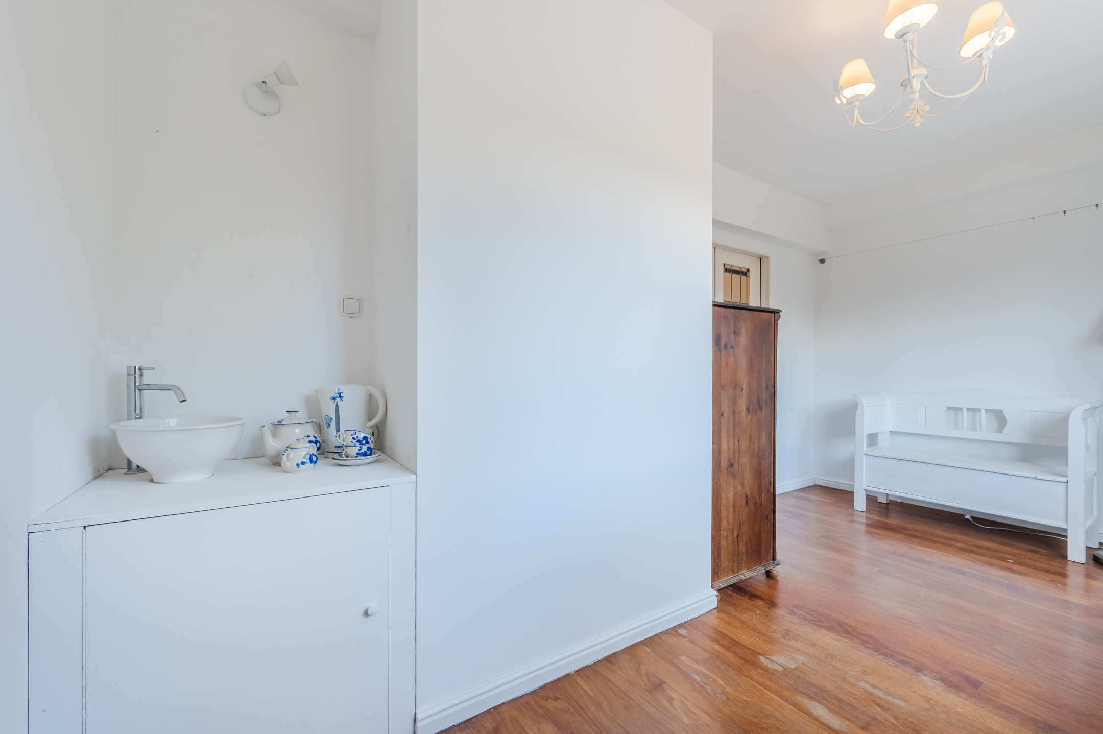 The second hall contains the stairs to the first floor and several storage cupboards. In one of these storage cupboards, you will find the connections for the washing machine and dryer. The second hall provides access to the closed kitchen.
