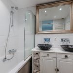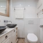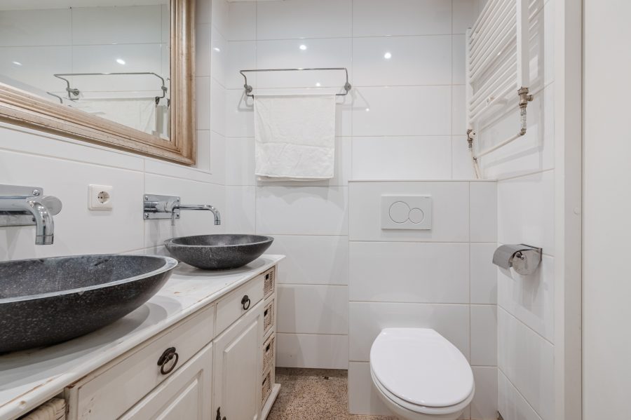 De tweede badkamer is ruim en keurig betegeld. Hier tref je een zwevend toilet, badmeubel met dubbele waskom en een ligbad met douche aan. De ruimte wordt verlicht met inbouwspots.