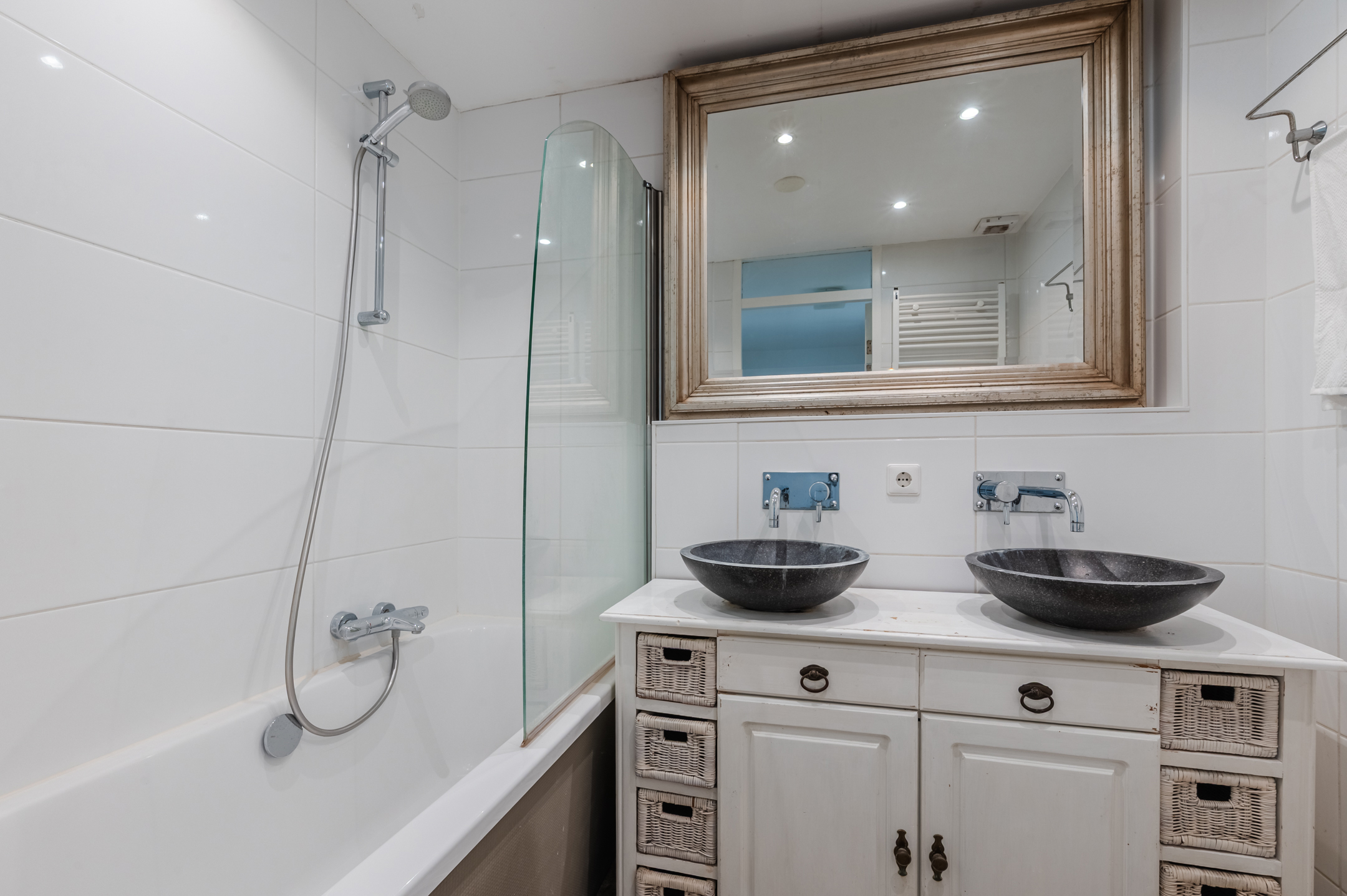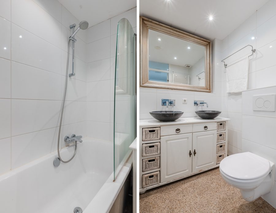 The second bathroom is spacious and nicely tiled. Here you will find a floating toilet, vanity unit with double sink and a bathtub with shower. The room is lit with recessed spotlights.