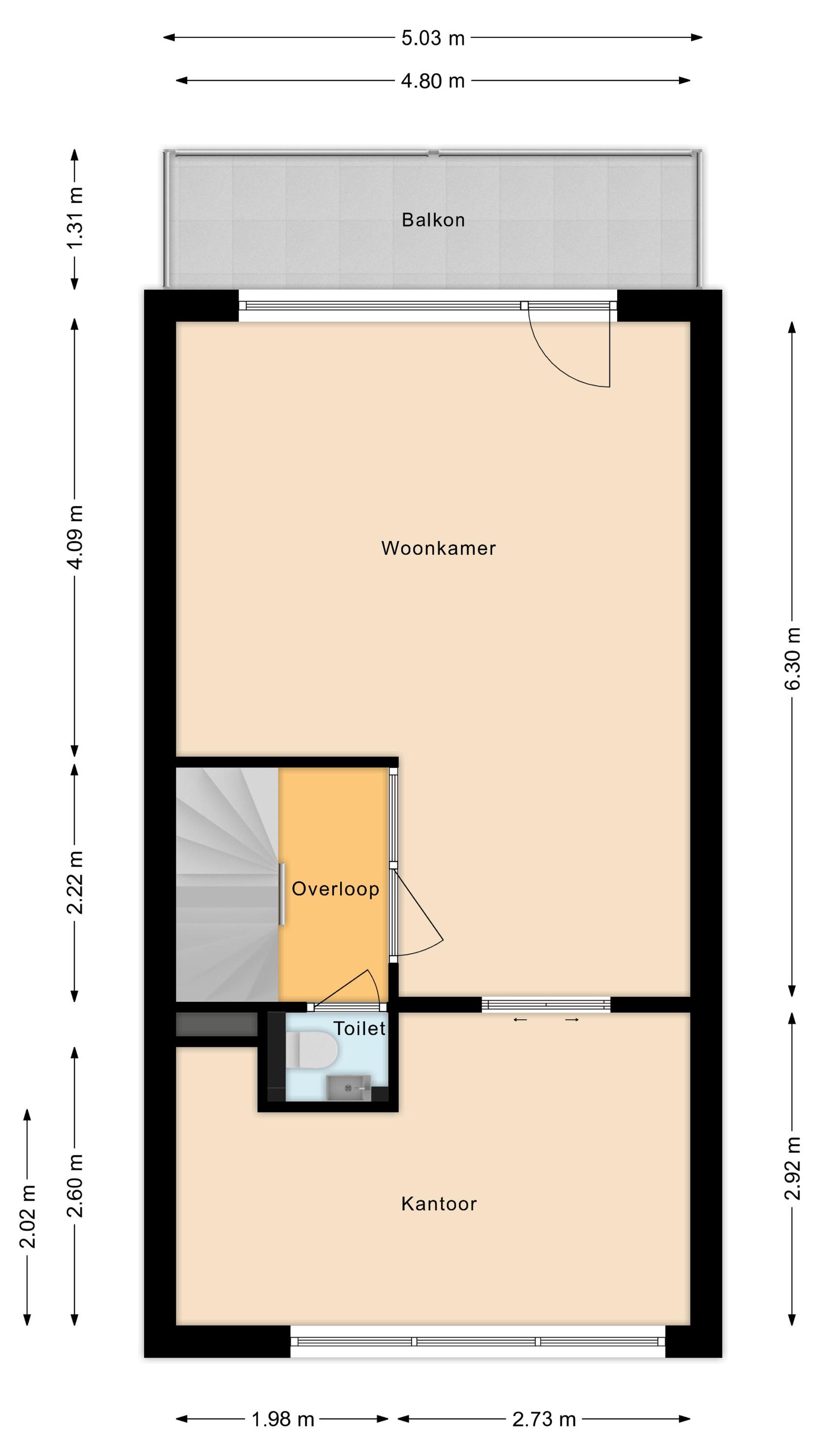 Op deze verdieping vind je een toiletruimte met zwevend toilet en fonteintje, de woonkamer en een kantoor. De woonkamer is royaal opgezet en afgewerkt met een mooie vloer en strakke wanden. Dankzij het grote raam en de openslaande balkondeur geniet deze kamer van een geweldige lichtinval. Vanuit de woonkamer stap je zo het balkon op. Hier is ruimte voor een kleine loungeplek.