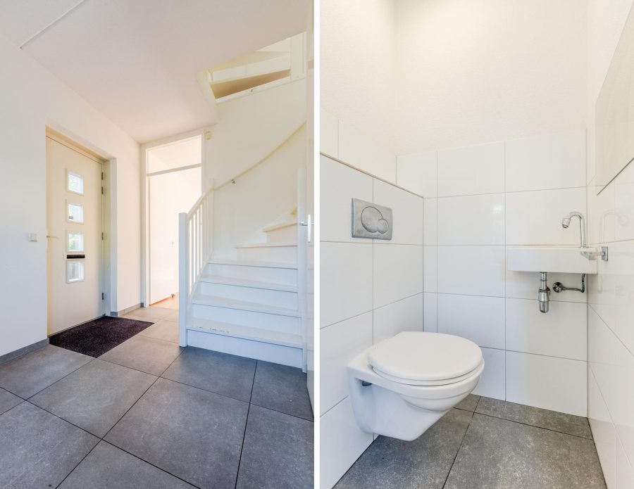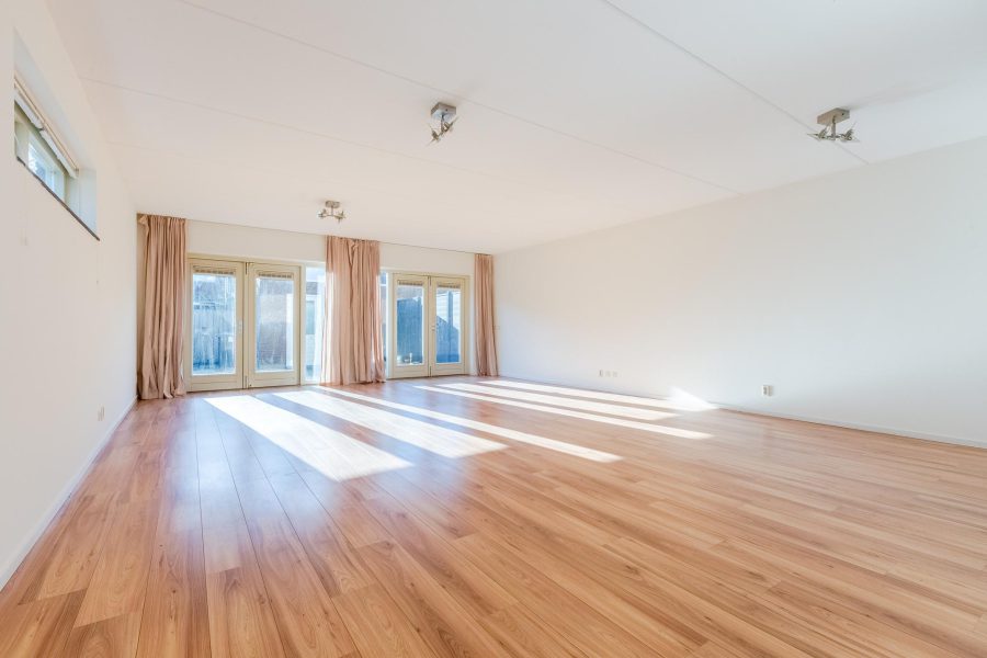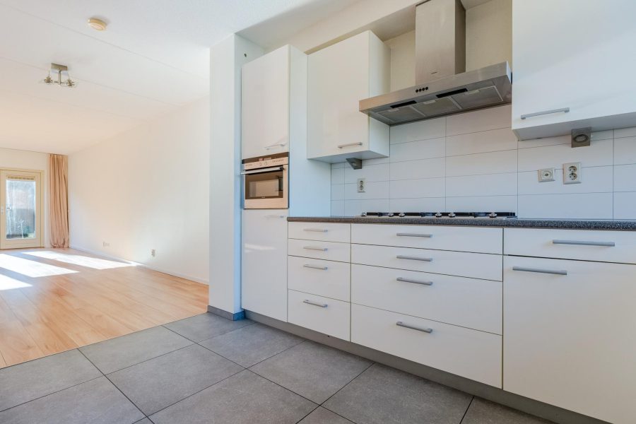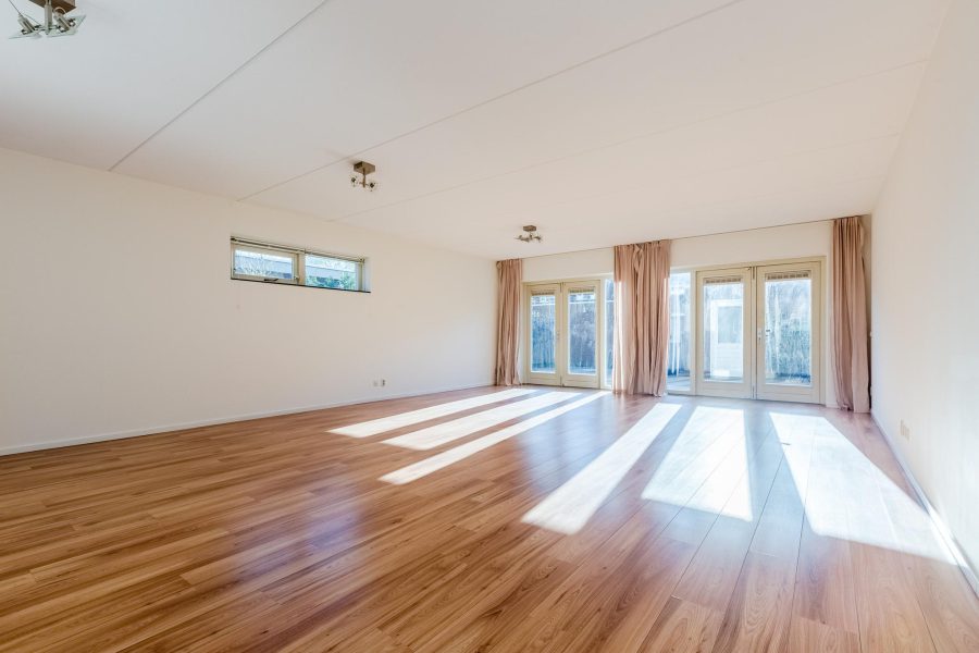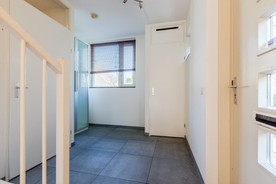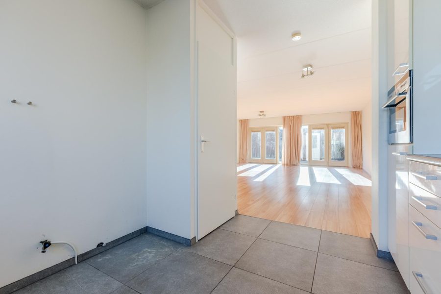 Through the covered front door, on the side of the house, we enter. Entrance with meter closet and wardrobe, floating toilet with hand basin, staircase to the first floor and access to the spacious living room with open kitchen. The bright living room is garden-oriented and has two pairs of French doors to the garden at the rear. High in the side wall is another window. At the front you will find the L-shaped kitchen. The kitchen has white fronts and is equipped with built-in and separate appliances. The kitchen has a wide window with an unobstructed view. In the kitchen there is a spacious stairs closet. Near the kitchen is room for a large dining table. The hall, toilet and kitchen have tiles on the floor and the living room has wooden floorboards. The walls and ceilings are finished sleek and neutral.