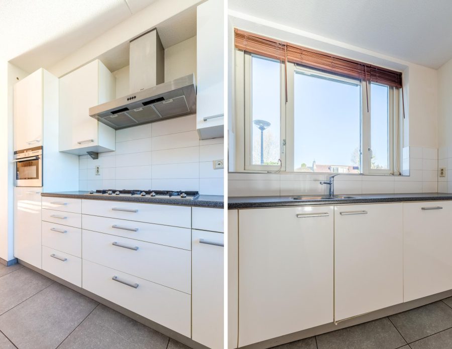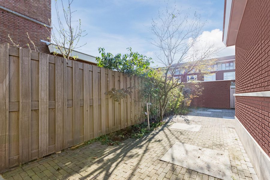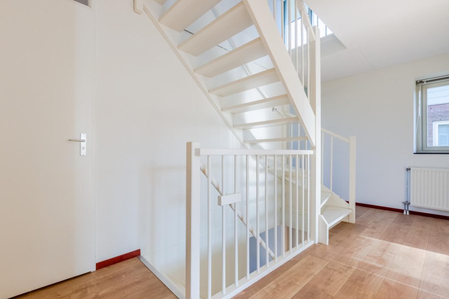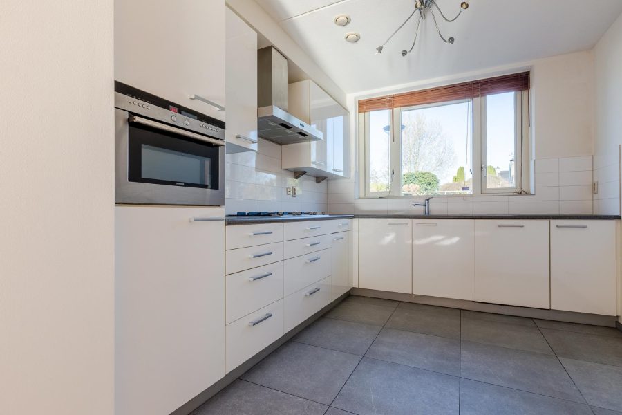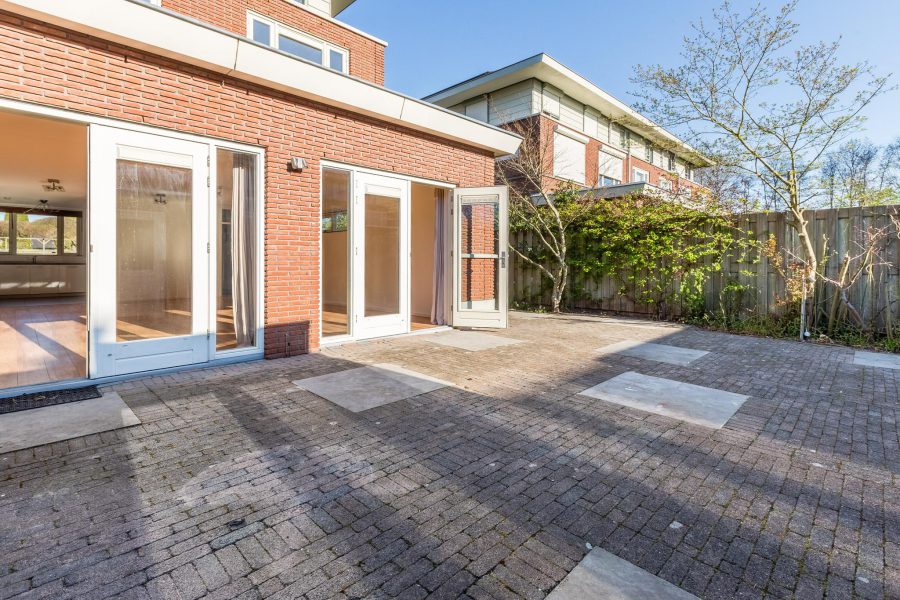 Through the covered front door, on the side of the house, we enter. Entrance with meter closet and wardrobe, floating toilet with hand basin, staircase to the first floor and access to the spacious living room with open kitchen. The bright living room is garden-oriented and has two pairs of French doors to the garden at the rear. High in the side wall is another window. At the front you will find the L-shaped kitchen. The kitchen has white fronts and is equipped with built-in and separate appliances. The kitchen has a wide window with an unobstructed view. In the kitchen there is a spacious stairs closet. Near the kitchen is room for a large dining table. The hall, toilet and kitchen have tiles on the floor and the living room has wooden floorboards. The walls and ceilings are finished sleek and neutral.