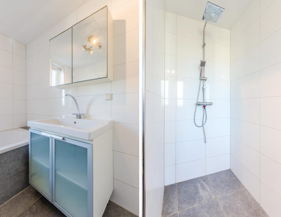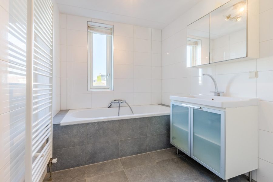 Via de trap in de hal bereiken we de overloop van deze verdieping. Hier treffen we drie slaapkamers, de badkamer en een separaat toilet aan. Twee slaapkamers liggen aan de achterzijde en de derde slaapkamer ligt aan de voorzijde, naast de badkamer. Alle slaapkamers zijn keurig afgewerkt en hebben een mooie lichtinval. De kamers bieden ruimte genoeg voor een bed en een werkplek. De lichte badkamer is voorzien van een badmeubel met wastafel en spiegelkast, een ligbad en een inloopdouche met hand- en regendouche.