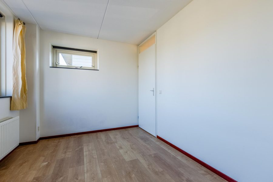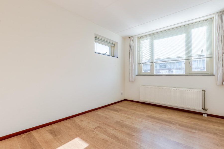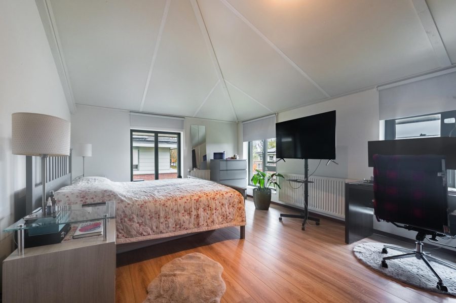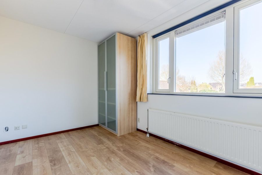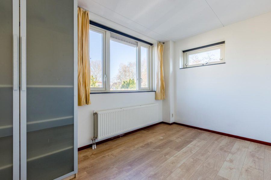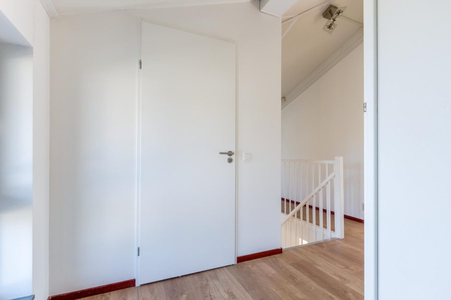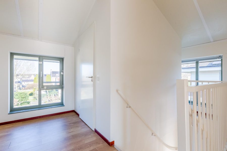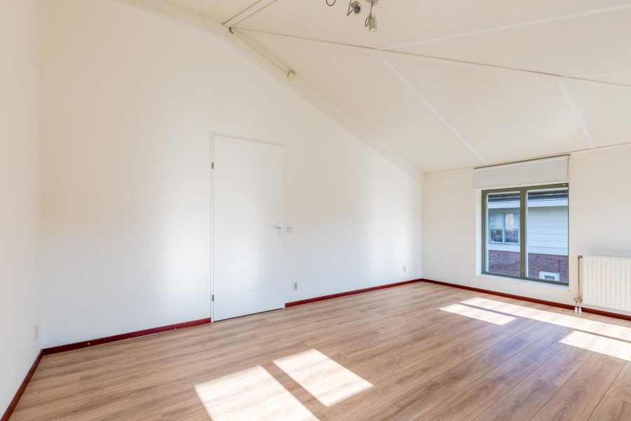 Via de open trap bereiken we de overloop van deze verdieping. Hier zijn een zeer ruime vierde slaapkamer te vinden, twee bergkasten, een wasruimte met de aansluiting voor het witgoed en de tweede badkamer. De royale slaapkamer heeft drie raampartijen en er is ruimte genoeg voor een tweepersoonsbed, een thuiswerkplek en/of hobbyruimte. Ook deze verdieping is keurig afgewerkt.