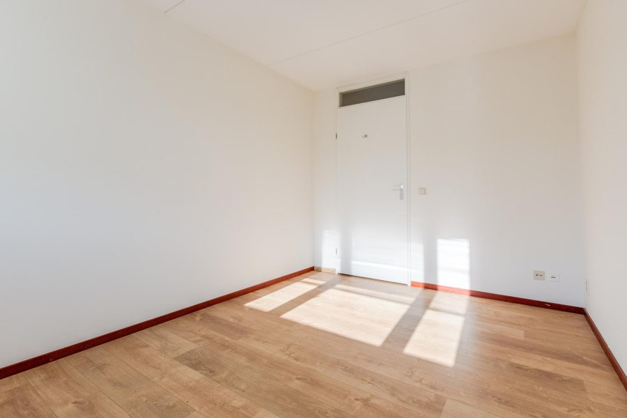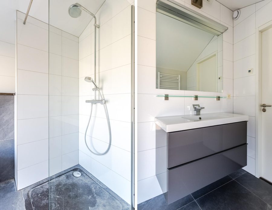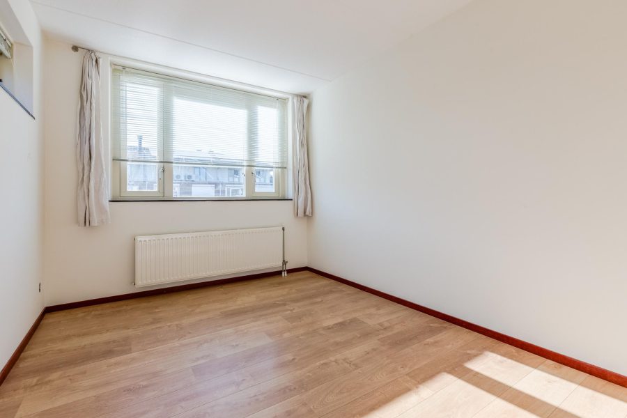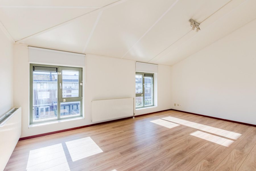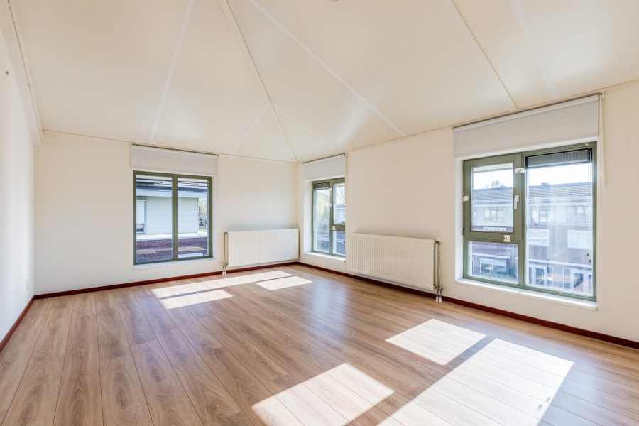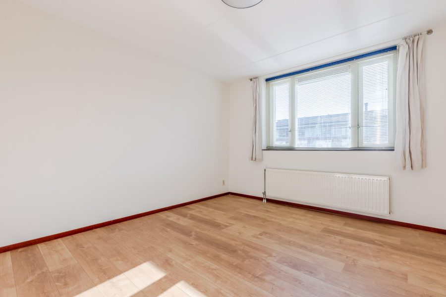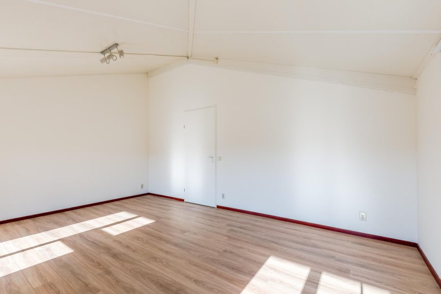 Via de open trap bereiken we de overloop van deze verdieping. Hier zijn een zeer ruime vierde slaapkamer te vinden, twee bergkasten, een wasruimte met de aansluiting voor het witgoed en de tweede badkamer. De royale slaapkamer heeft drie raampartijen en er is ruimte genoeg voor een tweepersoonsbed, een thuiswerkplek en/of hobbyruimte. Ook deze verdieping is keurig afgewerkt.