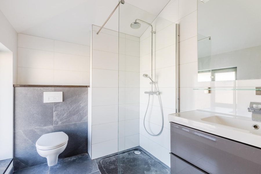 Through the stairs in the hall we reach the landing of this floor. Here we find three bedrooms, the bathroom and a separate toilet. Two bedrooms are at the rear and the third bedroom is at the front, next to the bathroom. All bedrooms are nicely finished and have a nice light. The rooms offer enough space for a bed and a workstation. The bright bathroom has a vanity unit with sink and mirror cabinet, a bathtub and a walk-in shower with hand and rain shower.