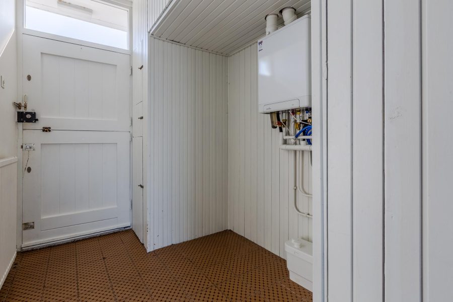 Naast de badkamer is een aparte ruimte voor de wasmachine, zodat je alles netjes uit het zicht hebt.