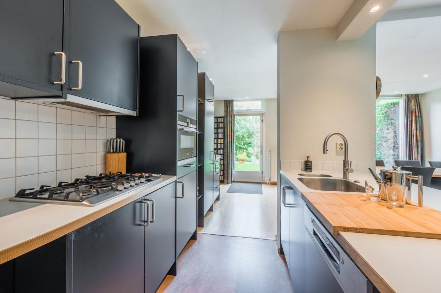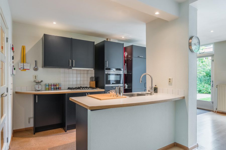 Through the partly green, partly paved front garden, we reach the front door of the house. Entrance with a wardrobe and a draft door leading to the hallway. Hallway with staircase to the first floor, stair cupboard, floating toilet with sink, and access to the living room with open kitchen. The bright living room has been extended at the rear and features two sets of windows and a door leading to the garden. At the front, there is a large window. You have beautiful light in the living room and plenty of privacy. The kitchen is centrally located in the living room and has a sink island with anthracite gray fronts. The kitchen is equipped with various built-in appliances, including a Quooker and dishwasher (2023). The living room has a light beech parquet floor, and the walls and ceilings are neatly and neutrally finished.