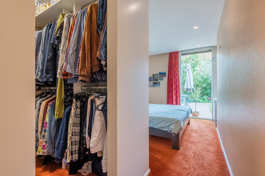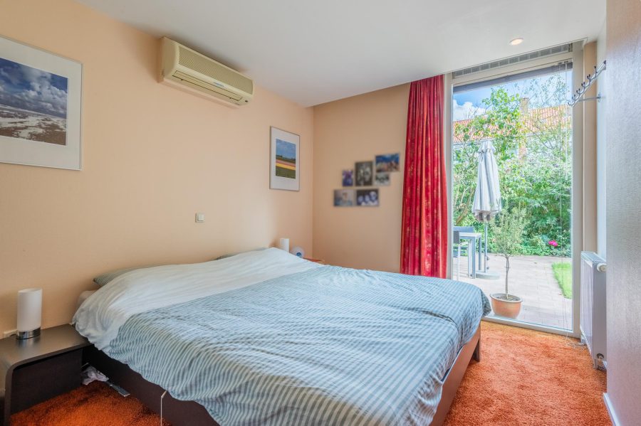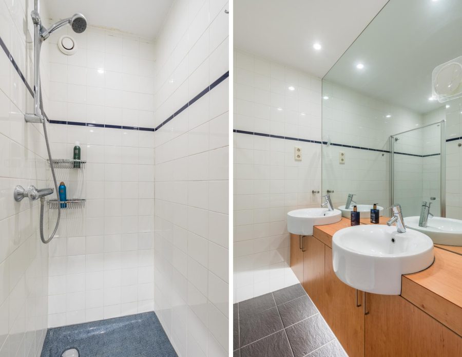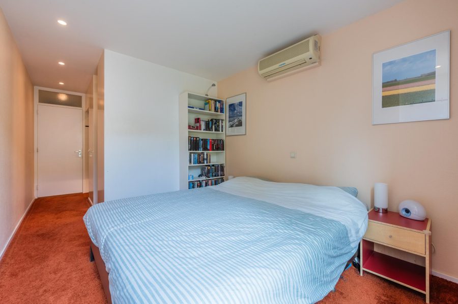 Terug in de hal heb je toegang tot de slaapkamer met ruime inloopkast en aansluitend de badkamer die is voorzien van twee moderne waskommen en een inloopdouche. De slaapkamer is voorzien van een hoge raampartij en airco.