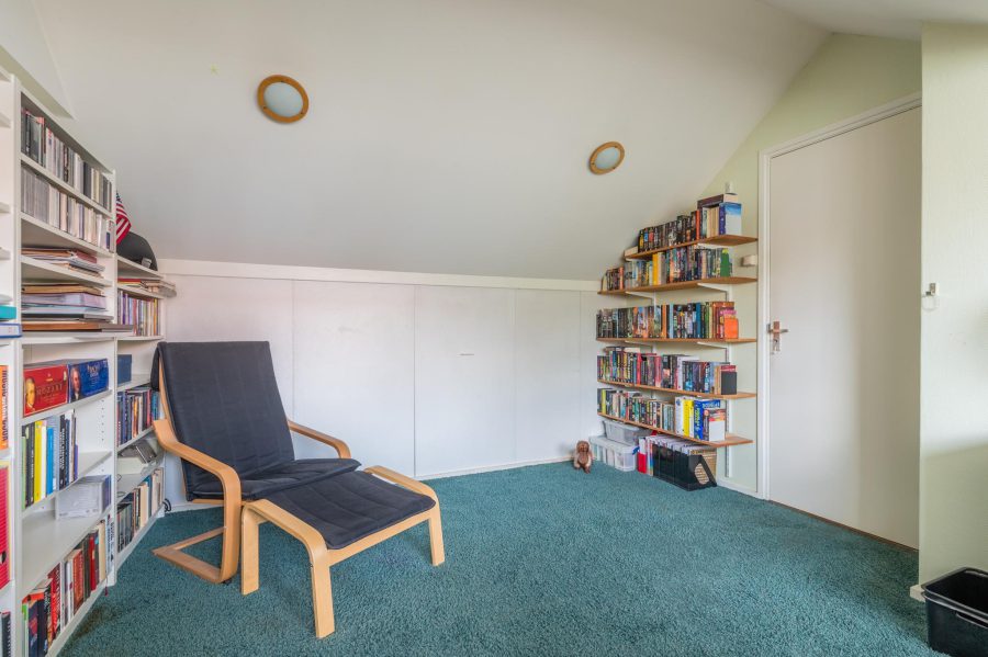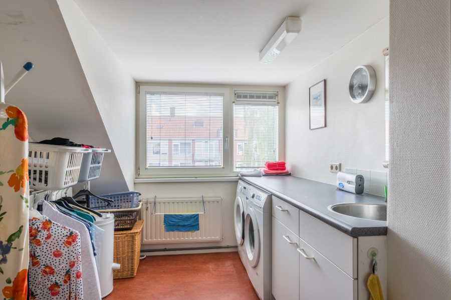 Via de vaste trap bereik je de overloop van deze verdieping. Deze verdieping heeft over de gehele achterzijde een dakkapel. De overloop heeft een open toegang tot de waskamer. Hier tref je een keukenblok met watervoorziening, opbergruimte en de aansluitingen voor het witgoed aan. Ook de cv-installatie is hier te vinden en via de ruime slaapkamer nog een afgesloten bergruimte.
