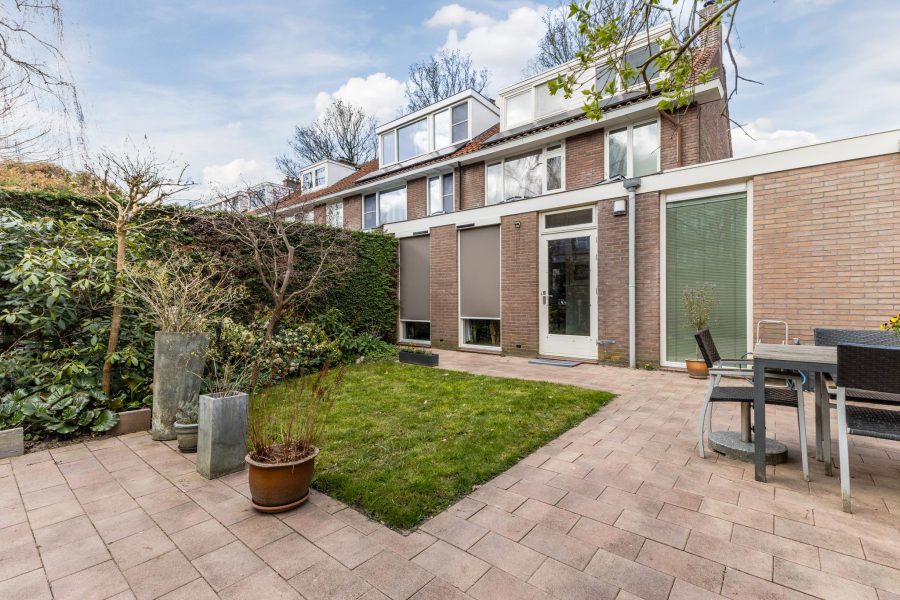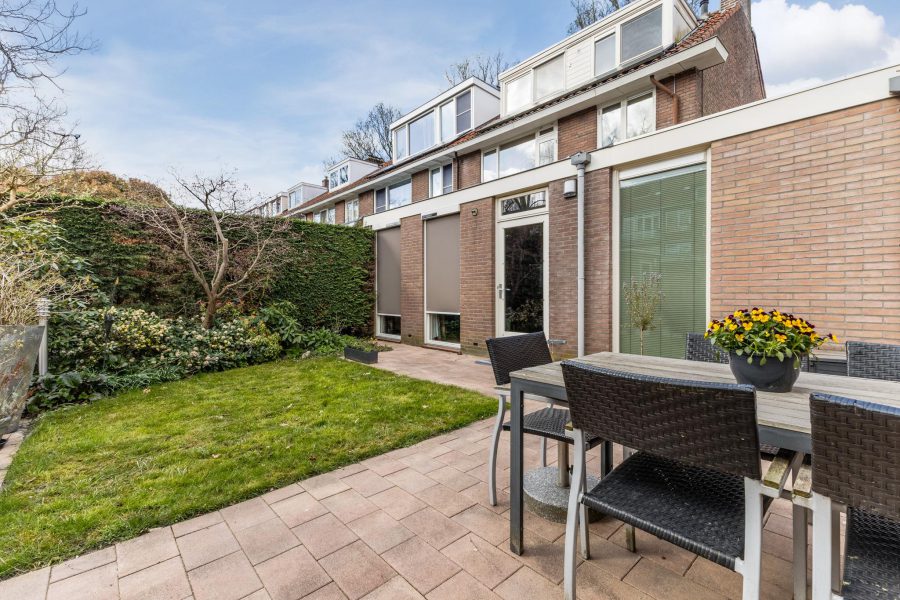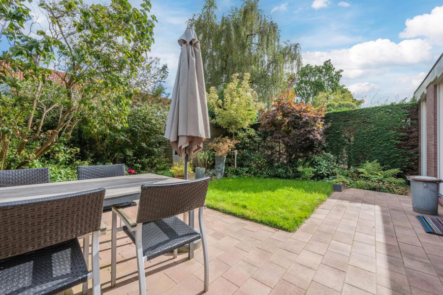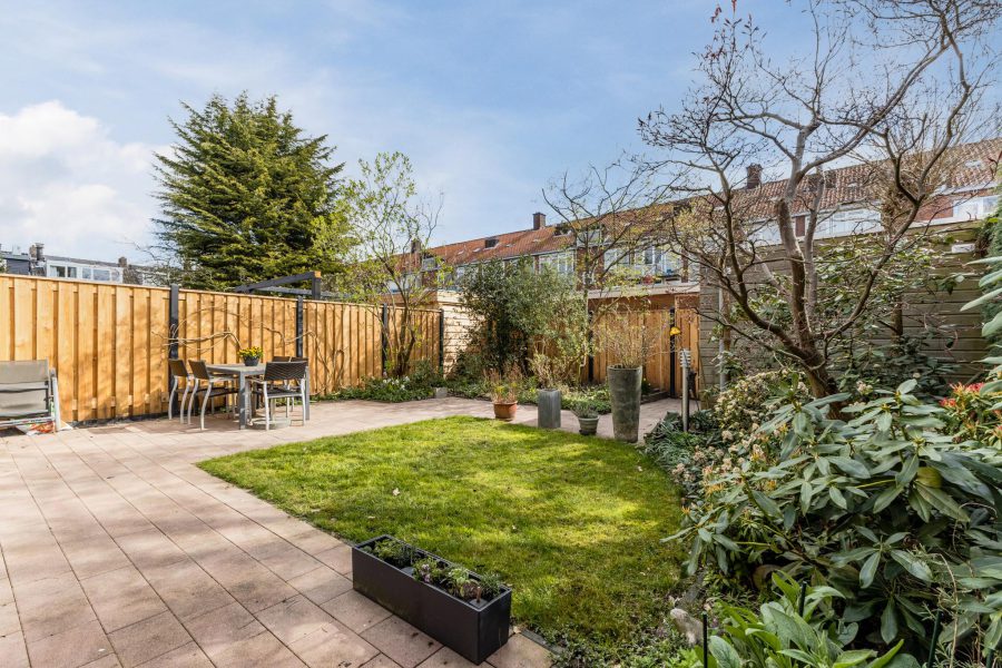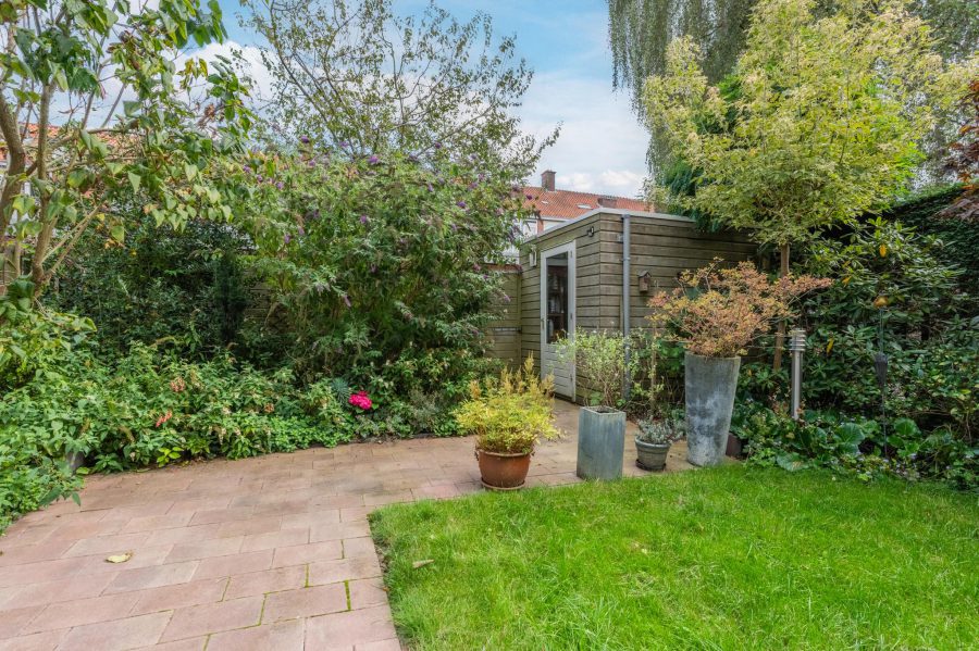 De woning heeft een volgroeide voortuin met vaste planten en bomen. Je hebt hier geen inkijk. De ruime achtertuin is deels groen en deels betegeld. De tuin heeft een nieuw terras (2023), groene borders en haag, een klein grasveld en een houten berging. Er is plaats genoeg om een fijne loungeplek te realiseren en/of een tafel buiten te plaatsen om gezellig buiten te eten in de zomermaanden. Het is een heerlijke, veilige speelplek voor de kinderen. Er is een achterom.