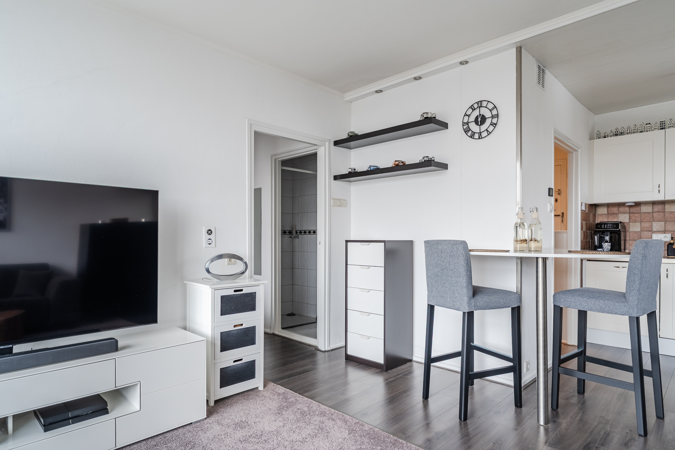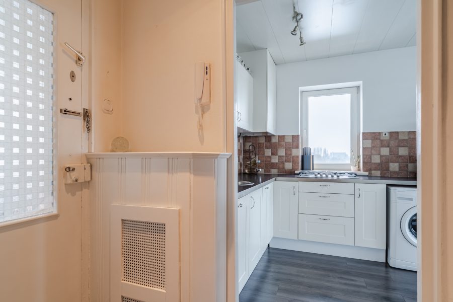 Achter de voordeur van het appartement bevindt zich een kleine entreehal. Vanuit hier heb je toegang tot de meterkast, een toiletruimte met staand toilet, en de woonkamer met open keuken.