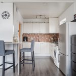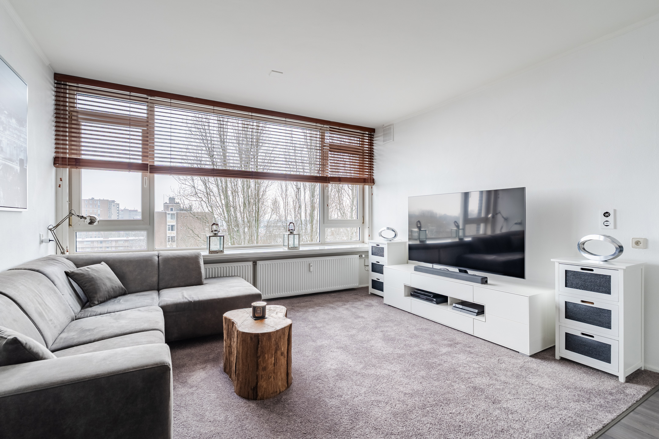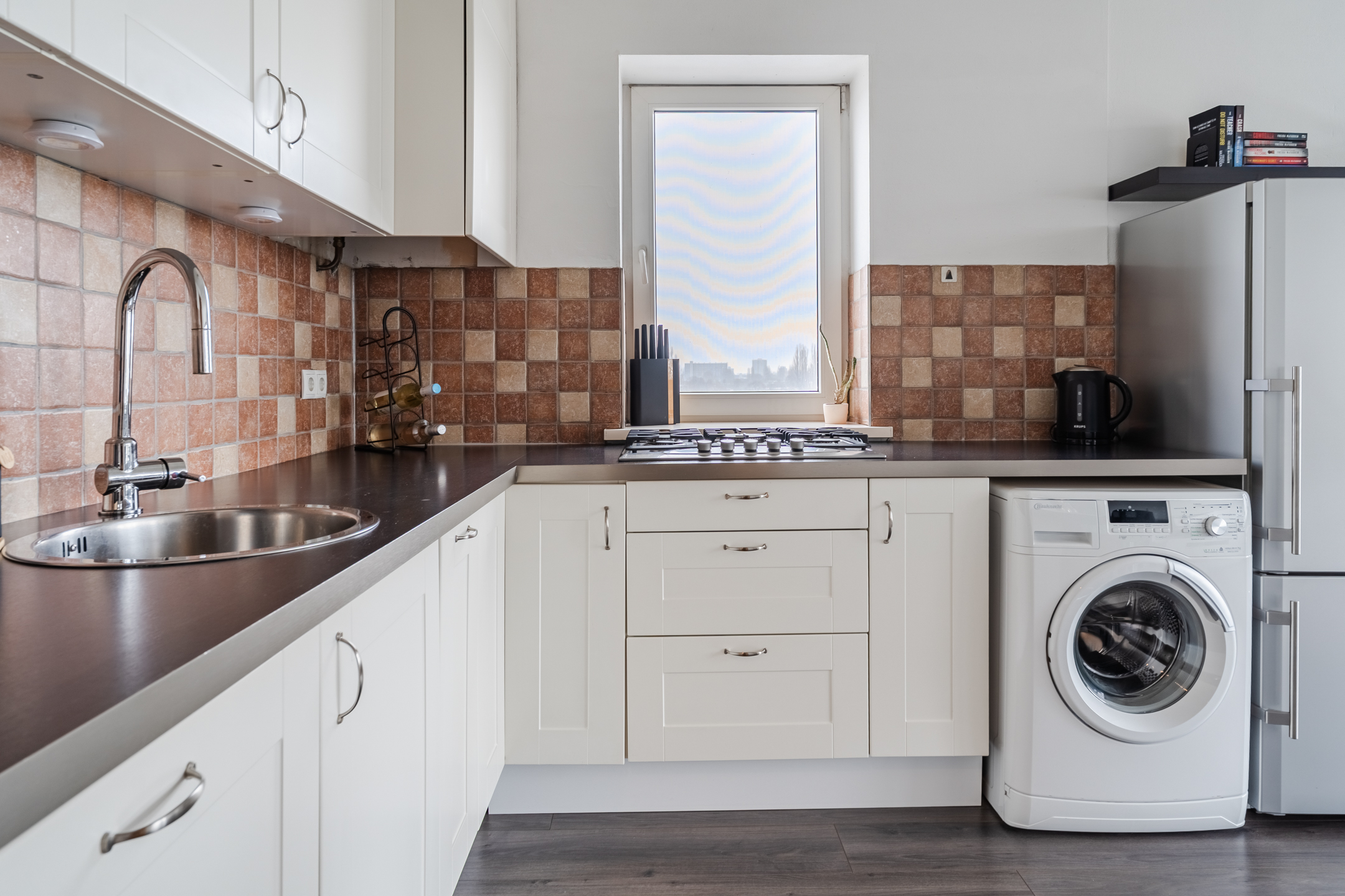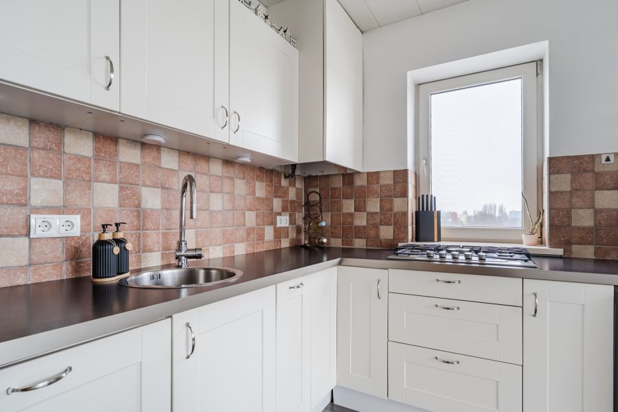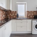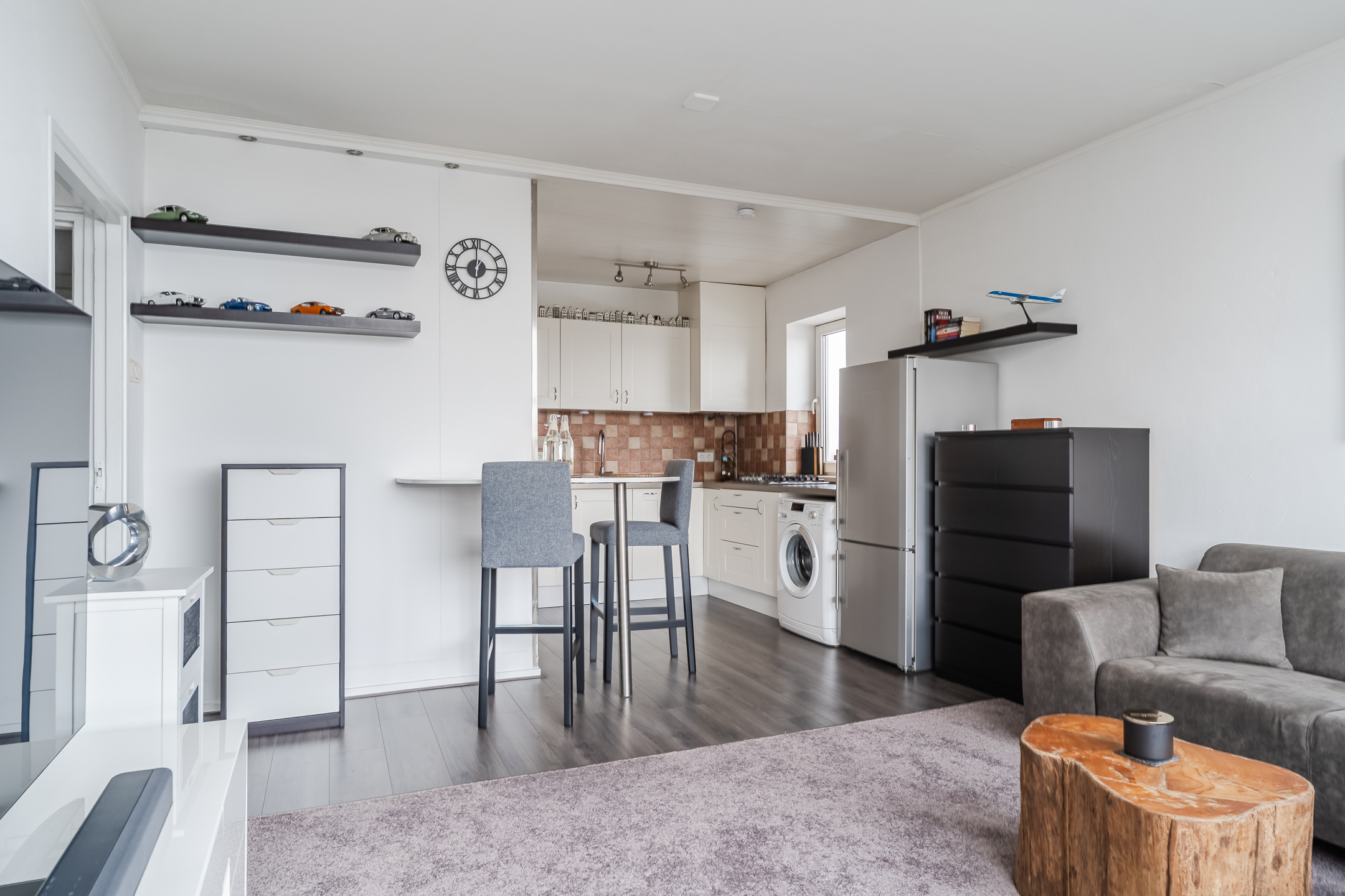 The spacious living room is partly carpeted and partly laminate. The wide window at the back provides plenty of natural light. At the front of the living room is the open kitchen. This is a corner unit and has a sleek design with white cabinets and a dark countertop. Here you will find a gas stove, dishwasher and washing machine connection.
