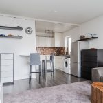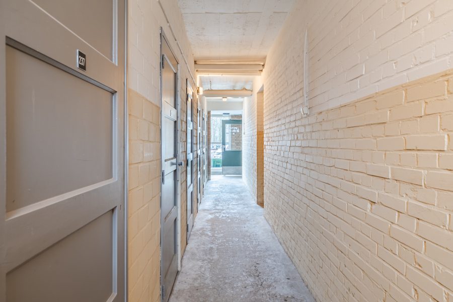 Behind the front door of the apartment is a small entrance hall. From here you have access to the meter cupboard, a toilet room with standing toilet, and the living room with open kitchen.