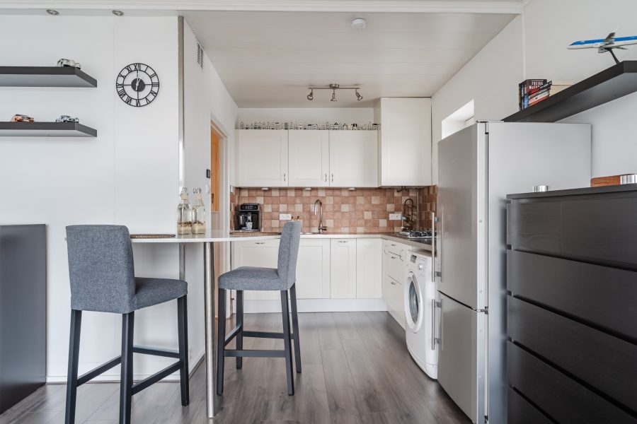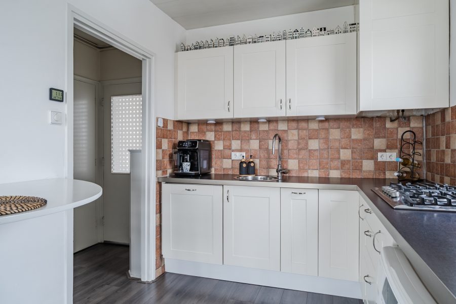 De ruime woonkamer is deels voorzien van tapijt en deels van laminaat. De brede raampartij aan de achterzijde zorgt voor veel natuurlijk licht. Aan de voorzijde van de woonkamer bevindt zich de open keuken. Deze is uitgevoerd in een hoekopstelling en heeft een strak design met witte kastjes en een donker werkblad. Je treft hier een gasfornuis, vaatwasser en wasmachine-aansluiting aan.