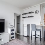 The living room leads directly into the apartment's bedroom. This room has dark flooring and enjoys pleasant natural light. There is space for a double bed and a practical wardrobe. The bedroom has an en-suite bathroom. This small, simple bathroom is finished with white floor and wall tiles. The room has a sink and a shower.