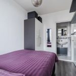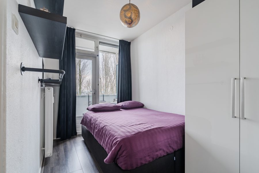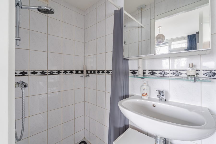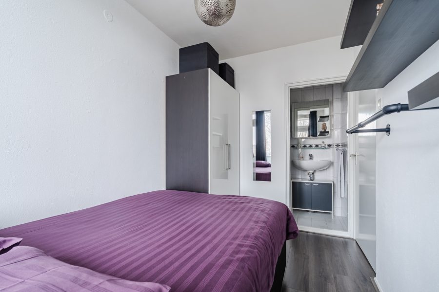 Via de woonkamer loop je zo de slaapkamer van het appartement binnen. Deze kamer beschikt over een donkere vloer en geniet van een prettige lichtinval. Er is ruimte voor een tweepersoonsbed en een praktische kast. De slaapkamer heeft een badkamer ensuite. Deze kleine, eenvoudige badkamer is afgewerkt met witte vloer- en wandtegels. De ruimte is voorzien van een wastafel en een douche.
