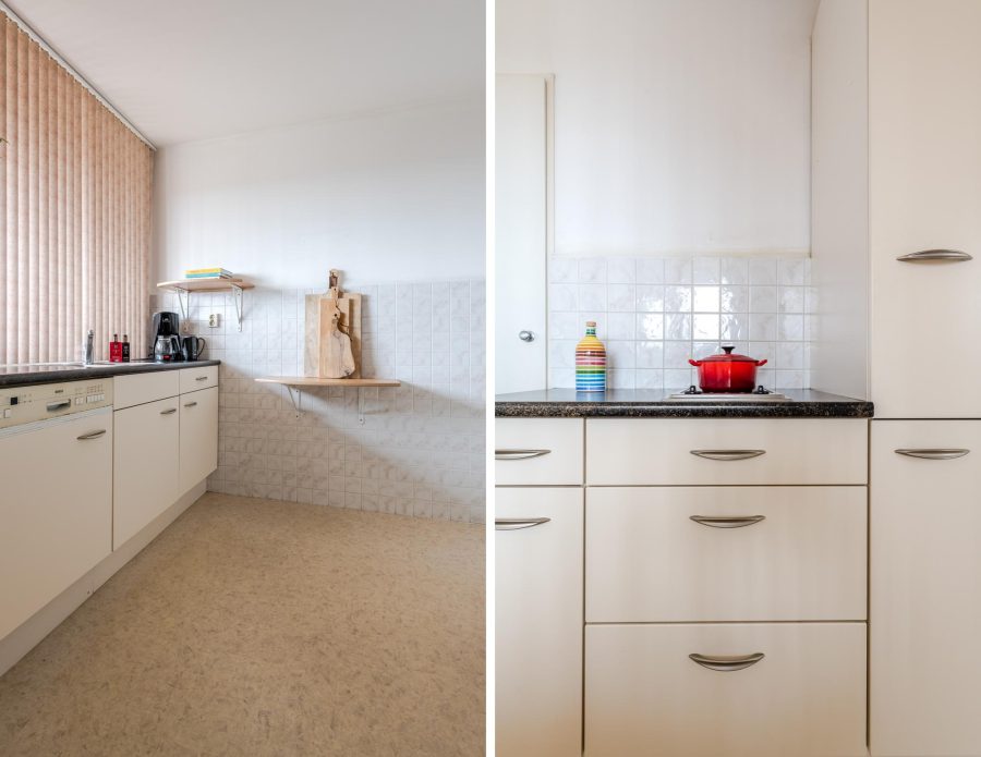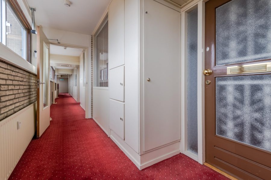 De lift brengt je naar de galerij op de 9e verdieping en de voordeur van de woning. De galerie is gesloten en overdekt en voorzien van tapijt. Entree (de meterkast bevindt zich buiten de woning) met direct aan je linkerhand de keuken met elektrische kookplaat, koelkast, vrieskast, vaatwasmachine en losstaande magnetron. In de keuken tref je ook een grote ingebouwde voorraadkast aan. Tegenover de keuken is de ruime slaapkamer te vinden. Hier is plaats voor een groot 2-persoonsbed. De slaapkamer is voorzien van een twee vaste kasten (plafondhoog).