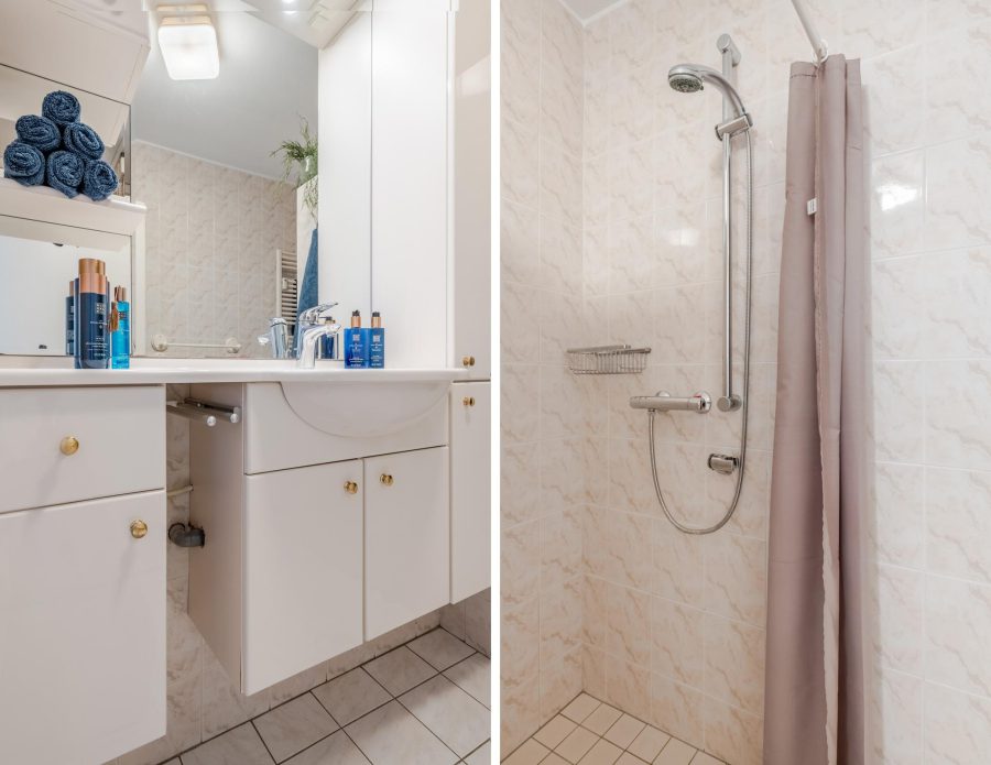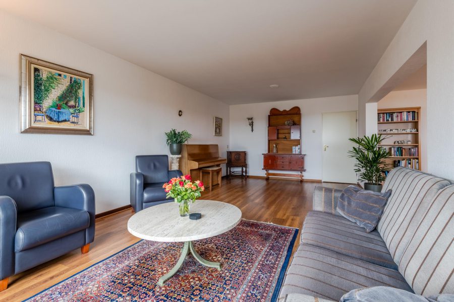 Further down the hallway is the separate toilet with a standing toilet and sink. Adjacent is the bathroom, which features a vanity unit with a sink and mirror, a designer radiator, and a walk-in shower. Laundry connections are also available here. The hallway also leads to a workroom with ceiling-high built-in wardrobes along the entire back wall, which could also be used as a walk-in closet. From a door, you can access the very spacious and bright living room. Formerly two rooms, this has now been combined into one large space with a sitting area and dining/working area, separated by an arch. With a simple alteration, this can easily be converted back into two rooms. Both areas have large windows and their own doors leading to the spacious balcony. The large south-facing balcony offers the perfect place for a lounge area, with a stunning, unobstructed view of the green surroundings. The apartment has a well-maintained parquet floor, and the walls and ceilings are finished in a clean, neutral style. A double built-in wardrobe also provides ample storage space.