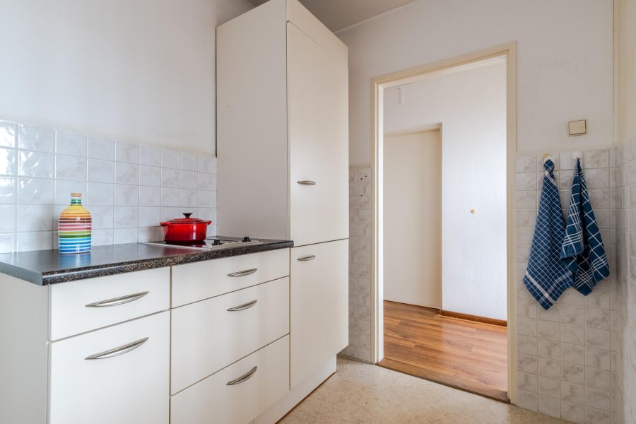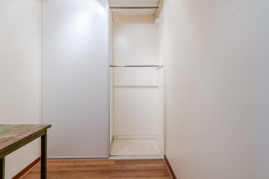 The lift takes you to the gallery on the 9th floor, where the front door of the apartment is located. The gallery is closed, covered, and carpeted. Entrance (the meter cupboard is located outside the apartment) with the kitchen immediately on the left. The kitchen is equipped with an electric hob, refrigerator, freezer, dishwasher, and a freestanding microwave. The kitchen also includes a large built-in pantry. Across from the kitchen is the spacious bedroom, which offers space for a large double bed. The bedroom has two built-in wardrobes (ceiling height).