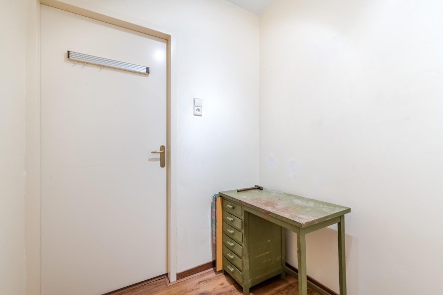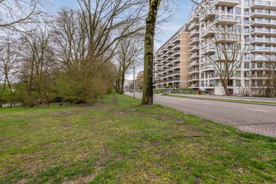 Verderop in de gang tref je de toiletruimte aan met een staande toilet en fonteintje. Daarnaast bevindt zich de badkamer, voorzien van een badkamermeubel met wastafel en spiegel, een designradiator en een inloopdouche. Ook de aansluitingen voor het witgoed zijn hier te vinden. Verder tref je in de hal nog een werkkamer aan met plafondhoge kastruimte over de gehele achterwand, die ook te gebruiken is als walk-in-closet. Via een toegangsdeur is de zeer ruime en lichte woonkamer te bereiken. Voorheen waren dit twee kamers, maar nu is er via een toog één geheel van gemaakt, zodat er een zit- en eet-/werkgedeelte is ontstaan. Met een eenvoudige ingreep zijn hier weer twee ruime kamers van te maken. Beide ruimtes hebben grote raampartijen en een eigen deur naar het ruime balkon. Op het ruime balkon met zuidelijke ligging kun je een fijne loungeplek realiseren, je hebt hier een prachtig vrij uitzicht over de groene omgeving. In het appartement ligt een goed onderhouden parketvloer en de muren en plafonds zijn strak en neutraal afgewerkt. Een dubbele ingebouwde kast biedt ook hier veel bergruimte.