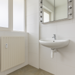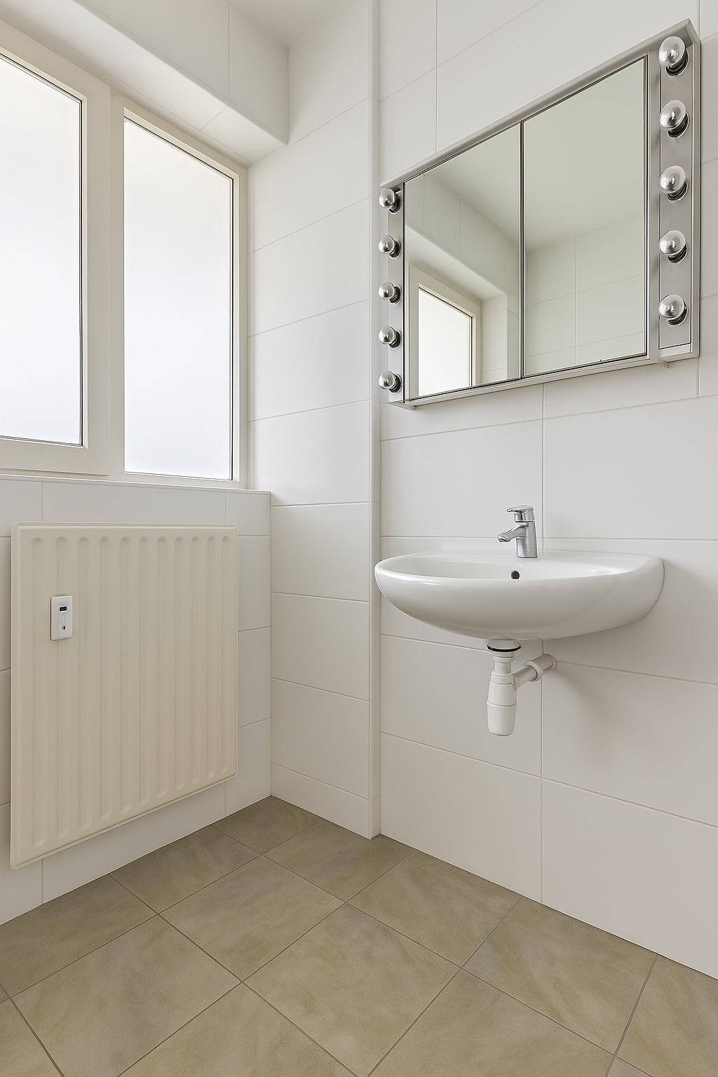 The spacious bathroom was renovated 12 years ago and finished with light-colored tiles. This room is equipped with a toilet, sink and walk-in shower. Also the washing machine connection is located here. The bathroom is partially lit with spotlights.