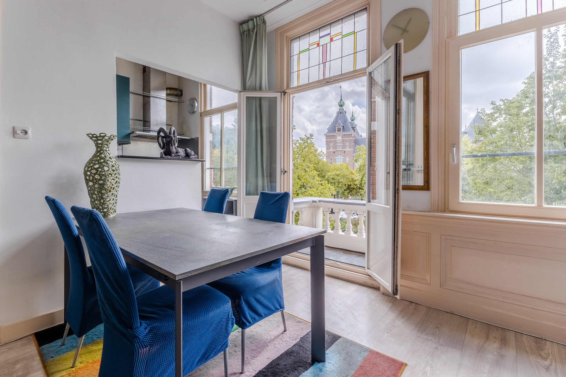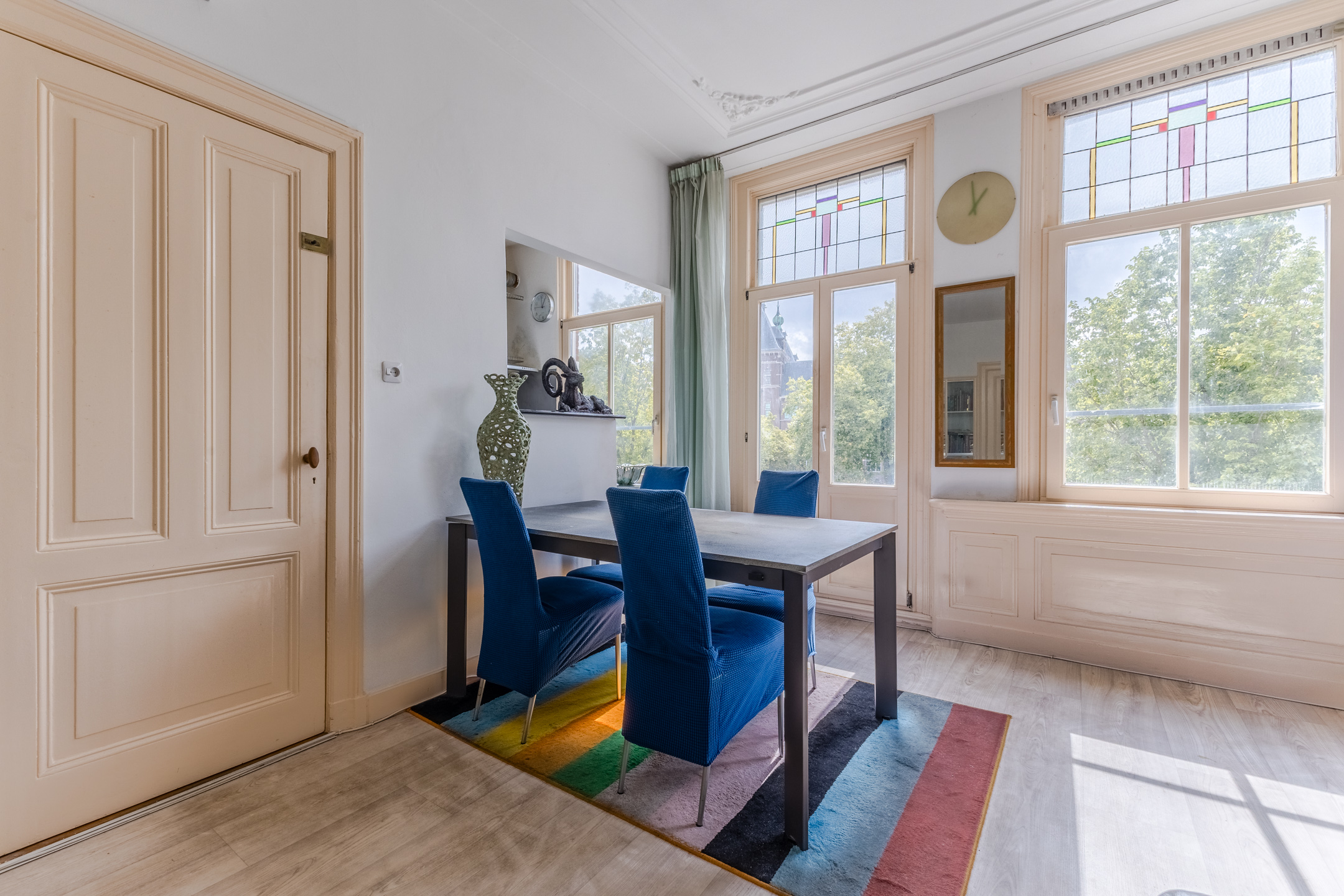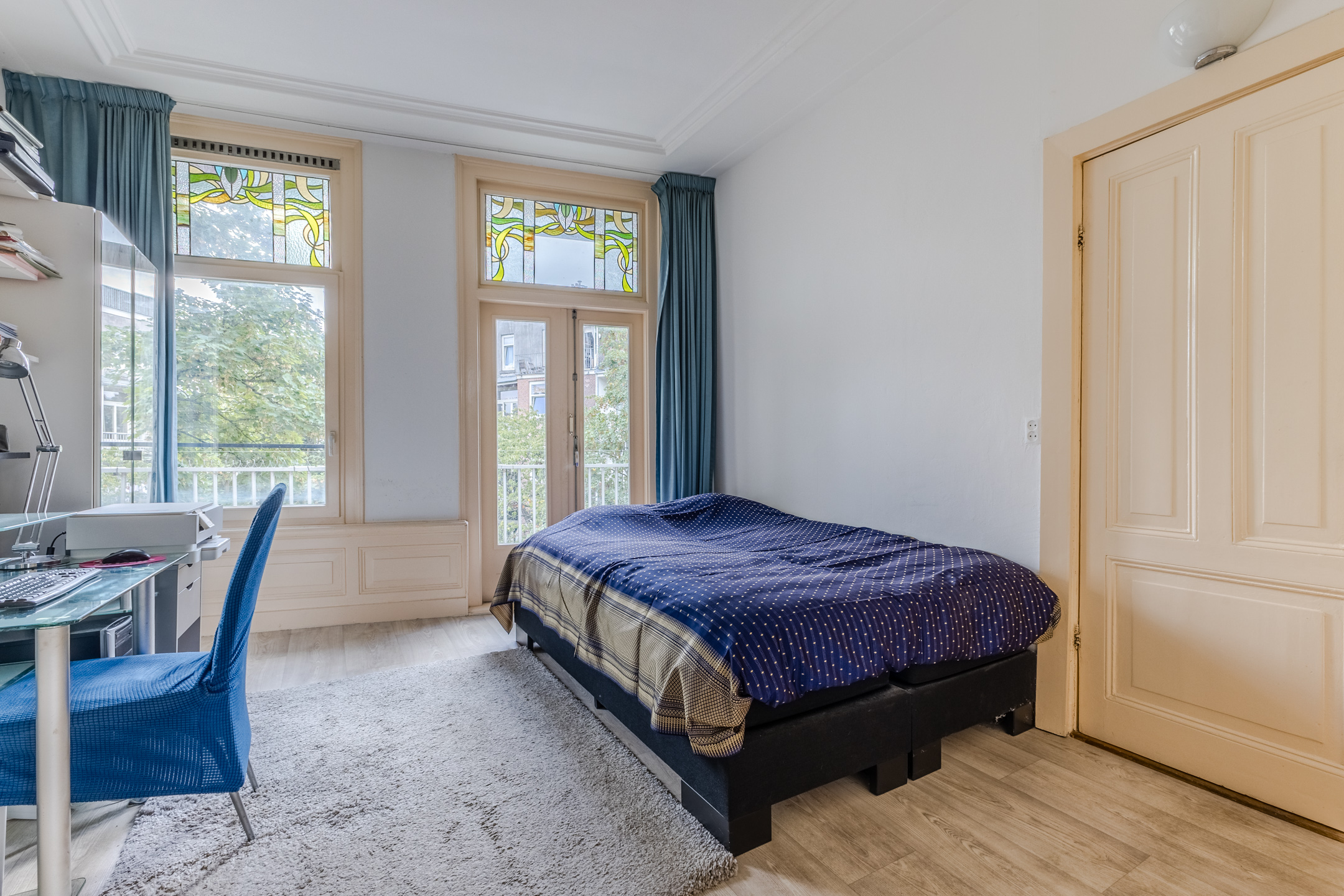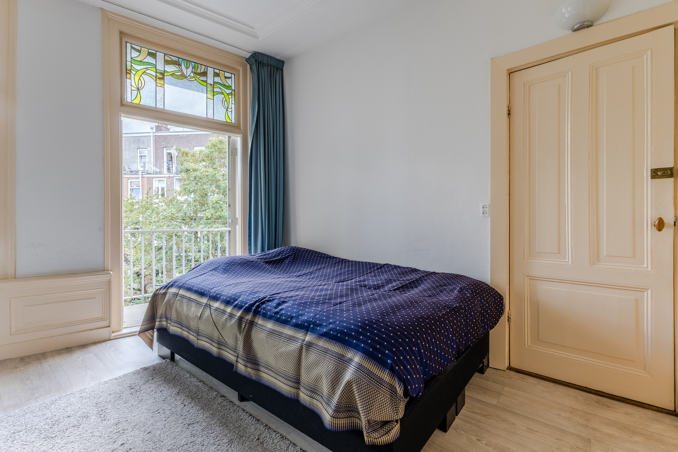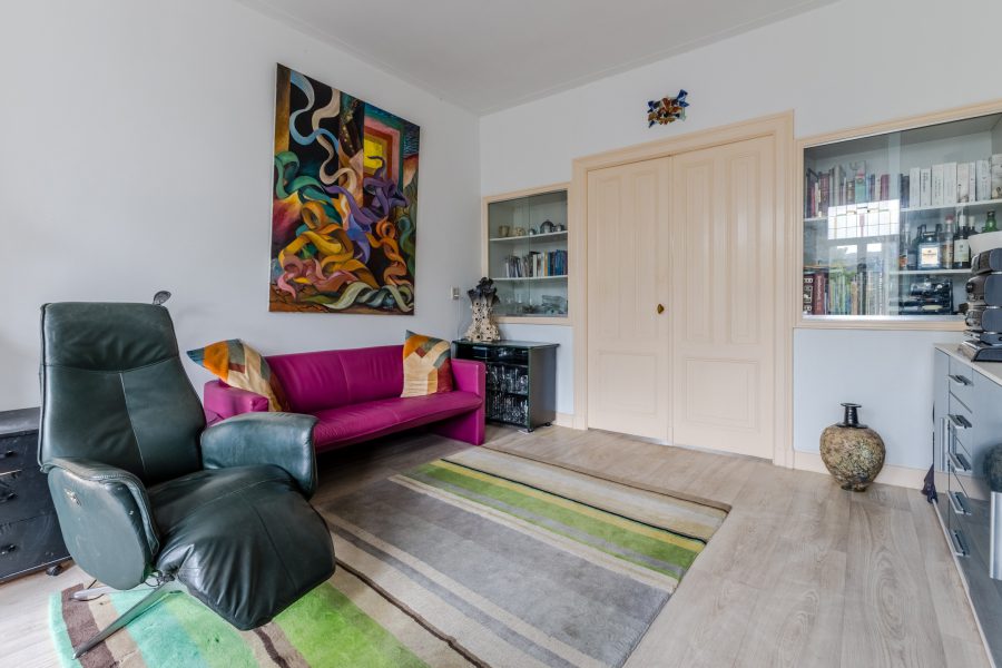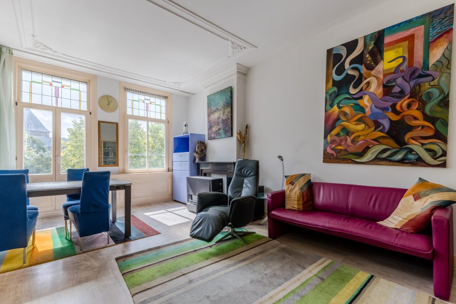 The apartment still features authentic details, such as stained glass windows and an ornamental ceiling. In the spacious living room you will find beautiful PVC flooring (2015). The large windows and balcony doors provide pleasant natural light. There is a gas heater in the living room. The living room opens onto a south-facing balcony, which offers a beautiful view over the water.