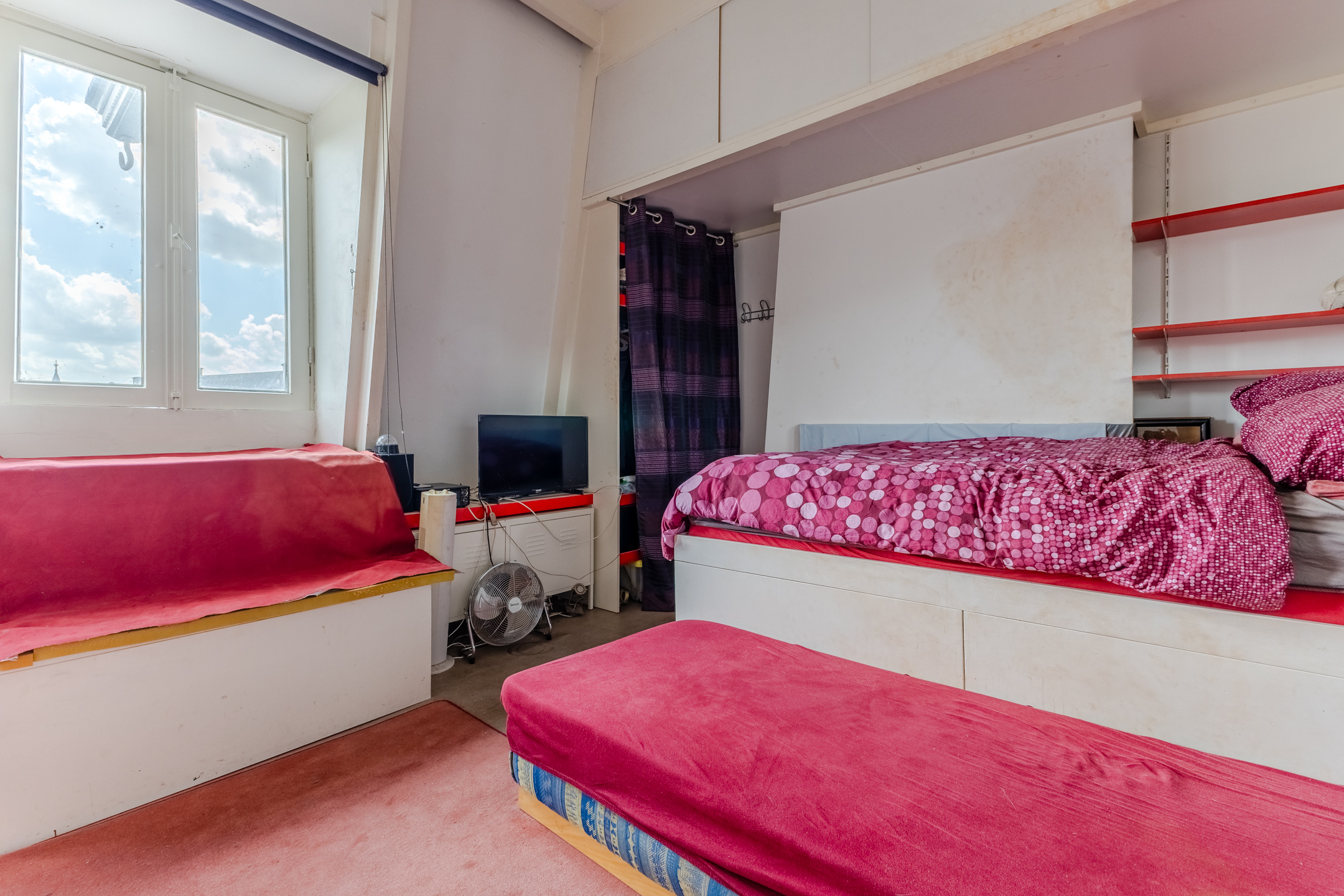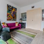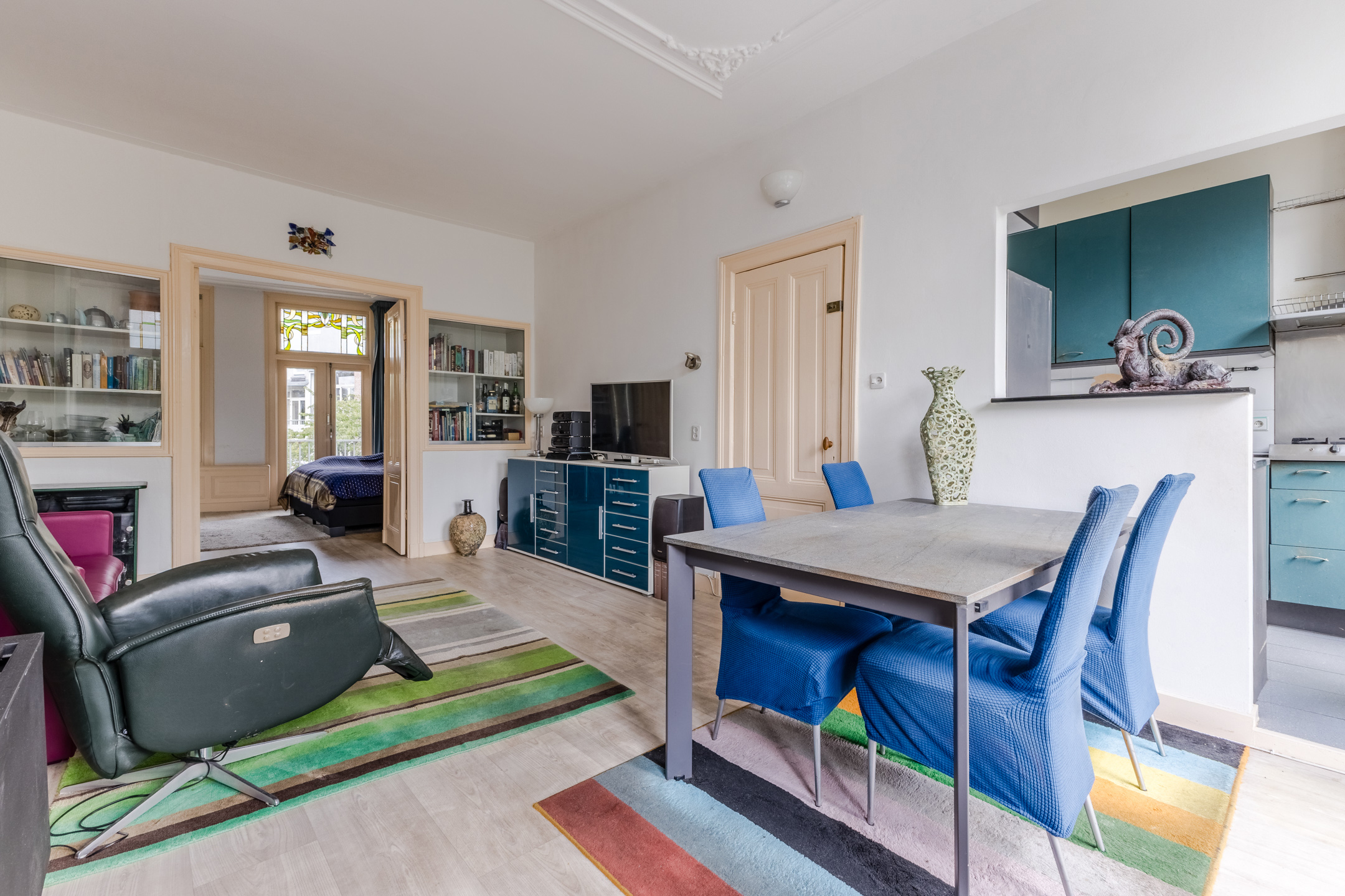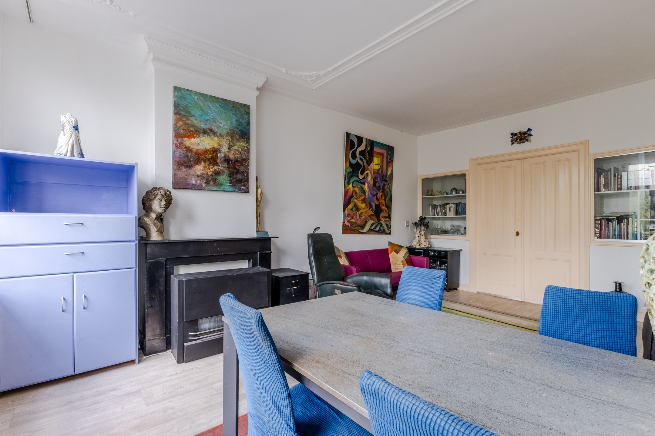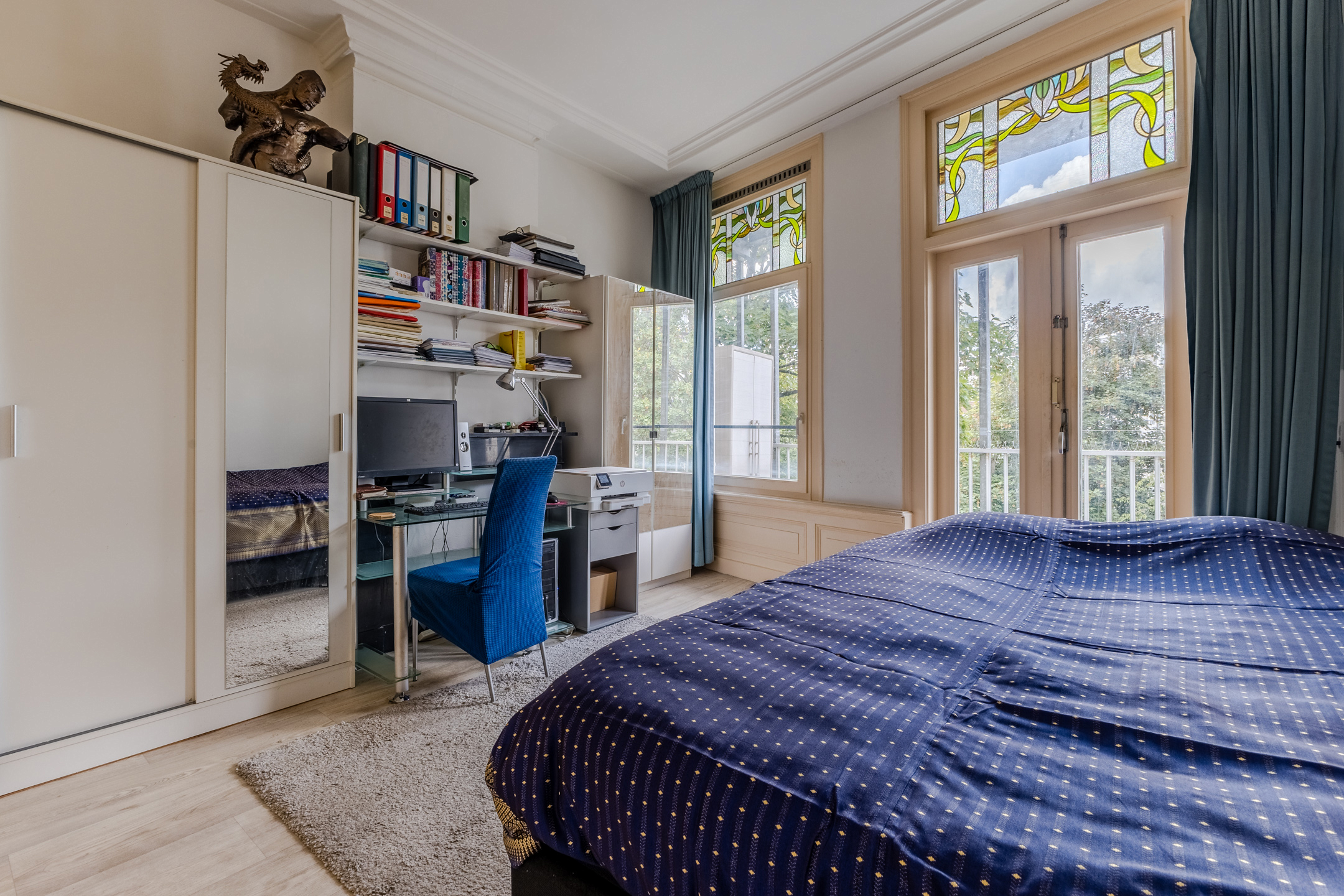 The apartment still features authentic details, such as stained glass windows and an ornamental ceiling. In the spacious living room you will find beautiful PVC flooring (2015). The large windows and balcony doors provide pleasant natural light. There is a gas heater in the living room. The living room opens onto a south-facing balcony, which offers a beautiful view over the water.
