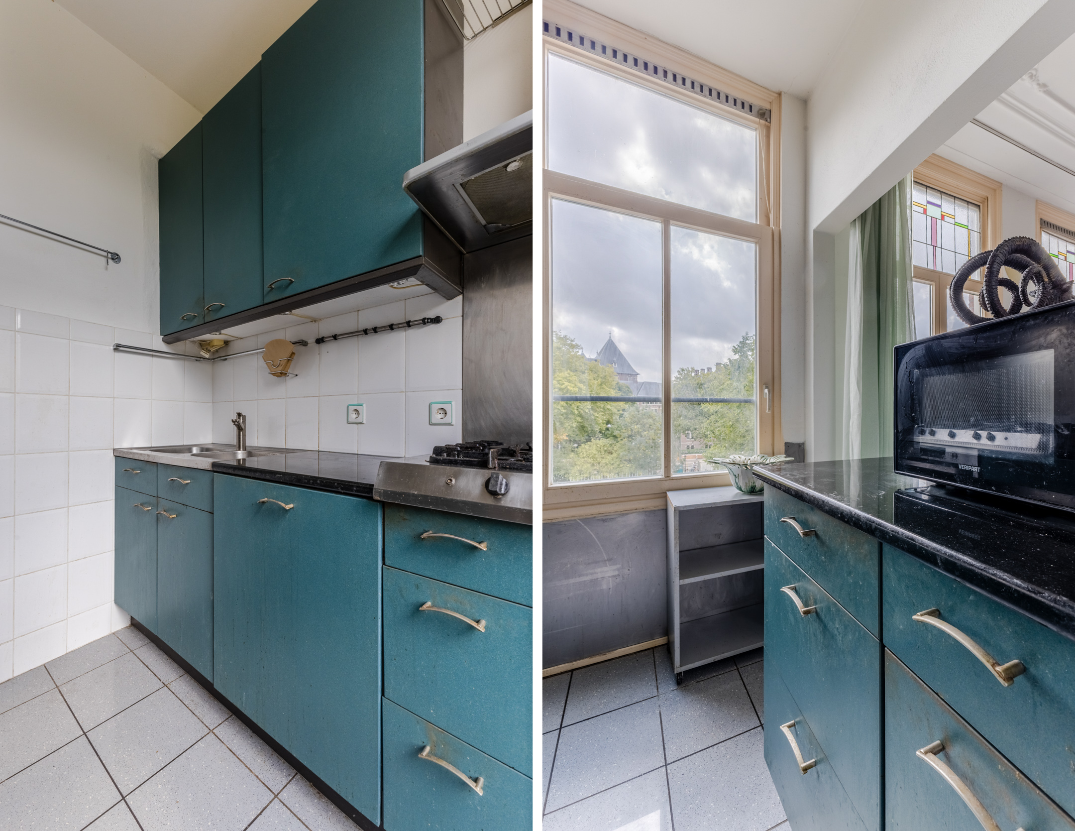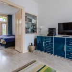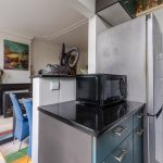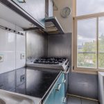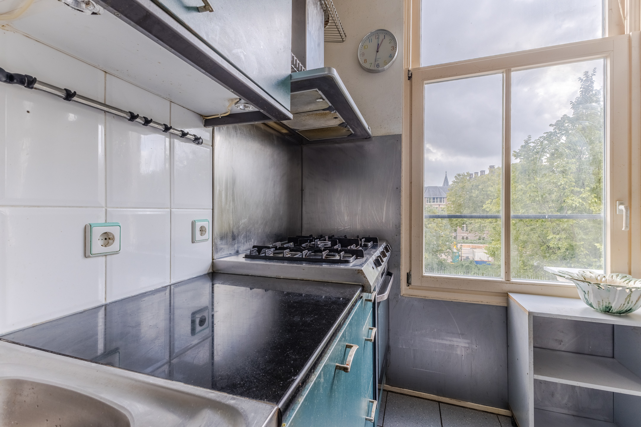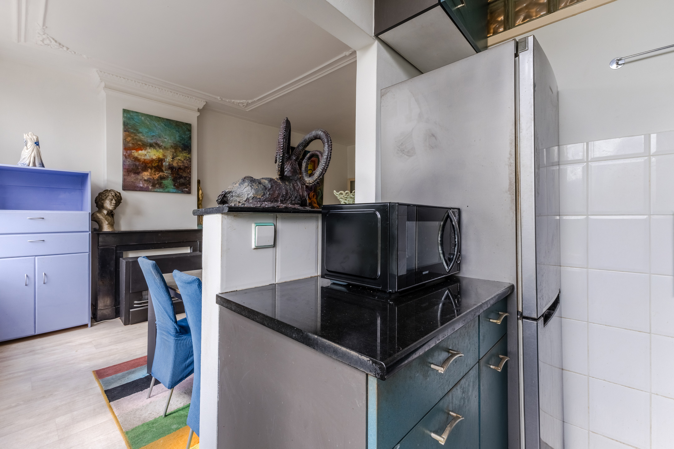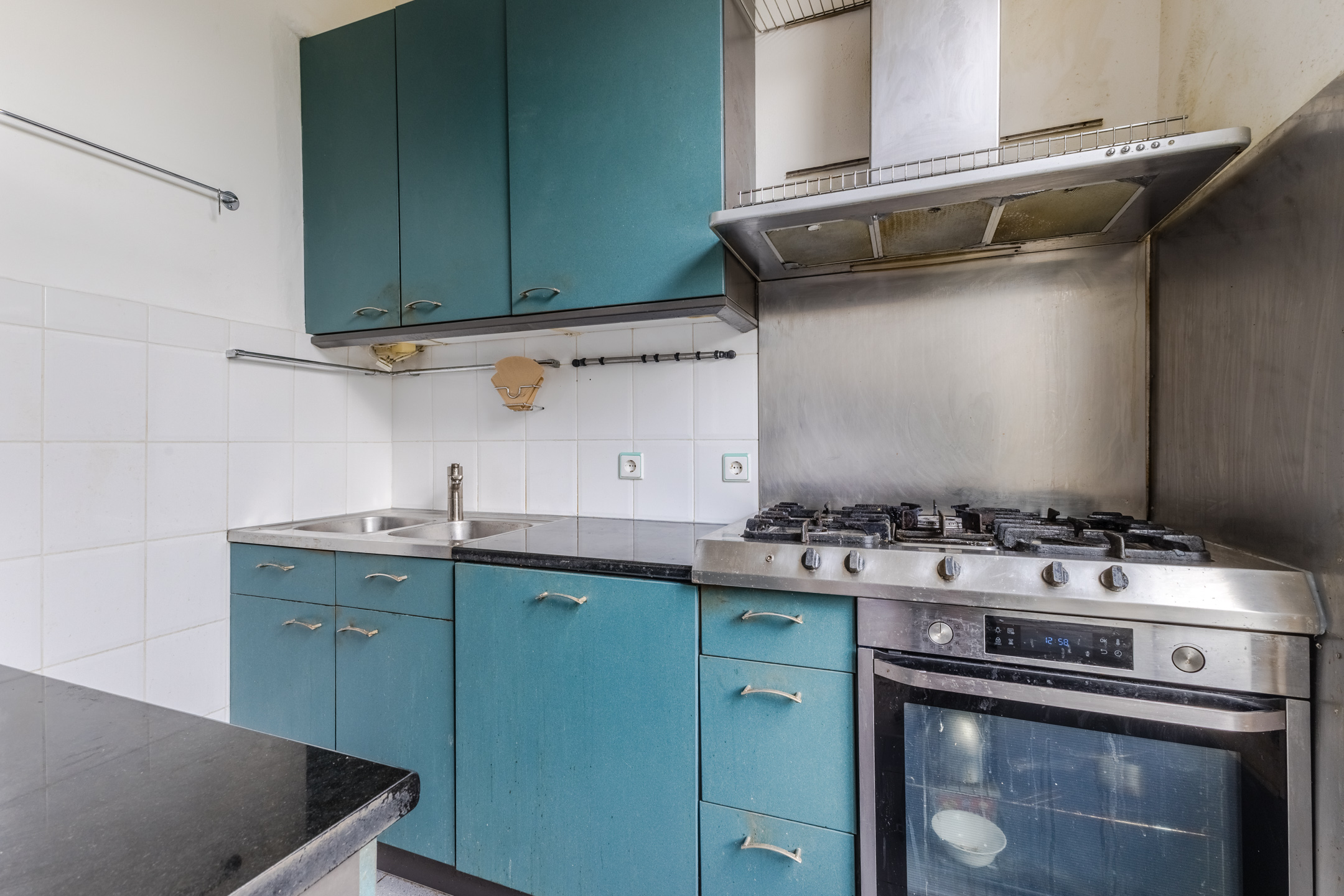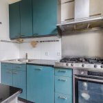 De halfopen keuken is gedateerd en bestaat uit twee keukenblokken. Het heeft een opvallend design met blauwgroene keukenkastjes en een donker granieten werkblad. Je treft hier de volgende apparatuur aan: vaatwasser, afzuigkap, gasstel en oven.