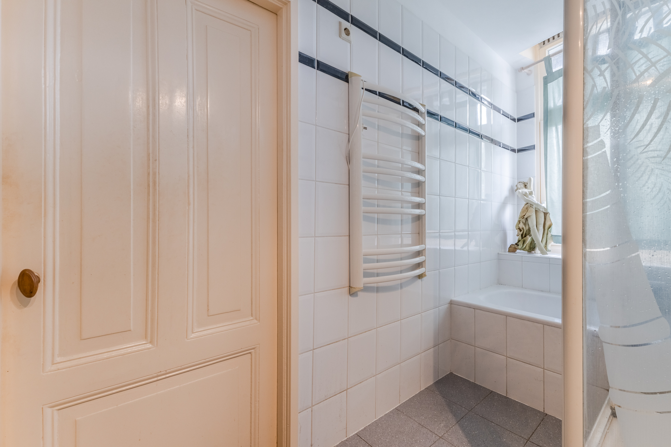 Through the living room you can also reach the apartment's first bedroom. This bedroom is spacious, nicely finished and wonderfully light. From here, you have access to the bathroom and the wide balcony. The spacious bathroom is finished with gray floor tiles and white wall tiles. This room is equipped with a floating toilet, sink, bathtub, shower cabin and designer radiator. There is also electric underfloor heating.