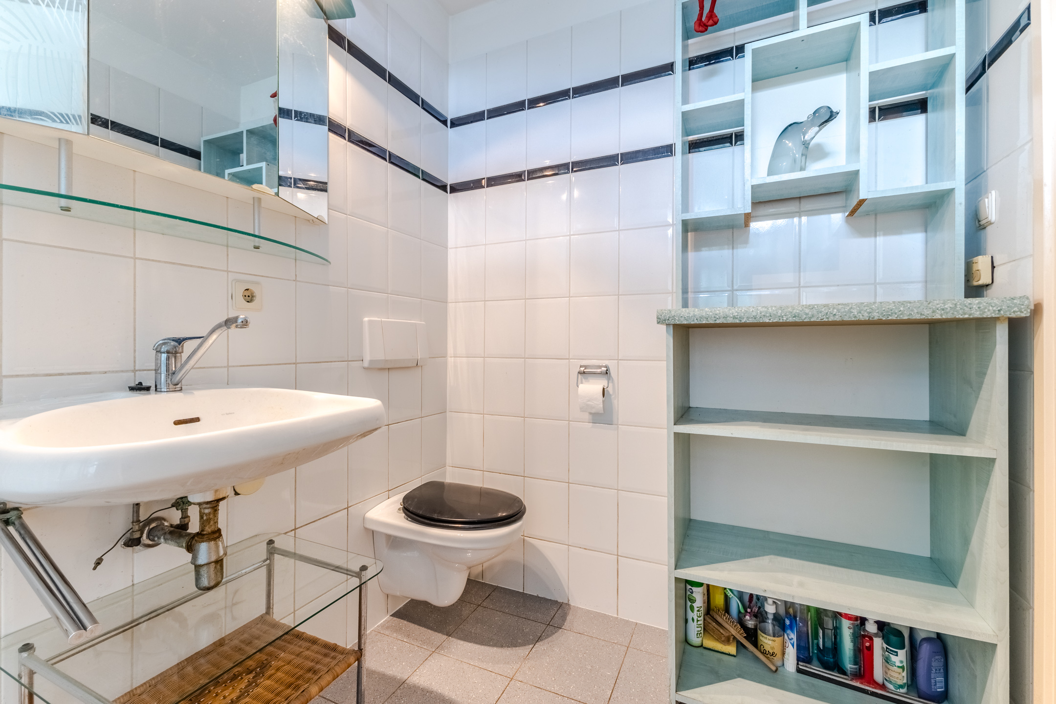 The semi-open kitchen is dated and consists of two kitchen units. It has a striking design with blue-green kitchen cabinets and a dark worktop. You will find the following appliances here: dishwasher, gas stove, extractor hood and oven.
