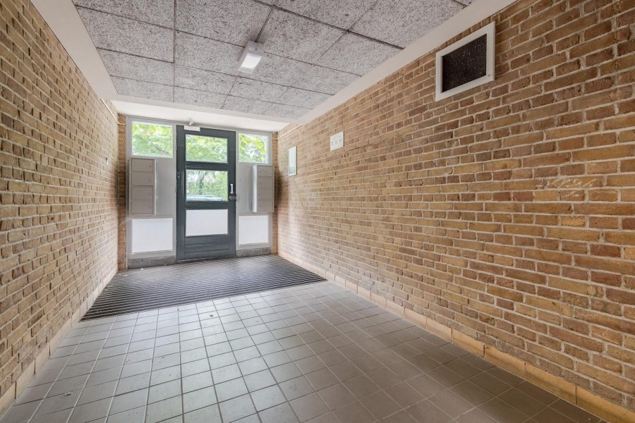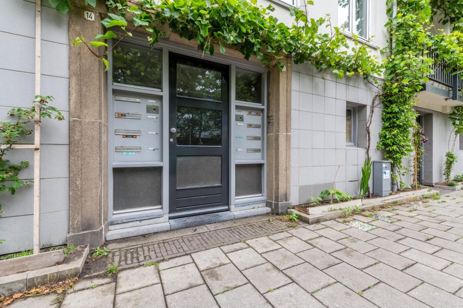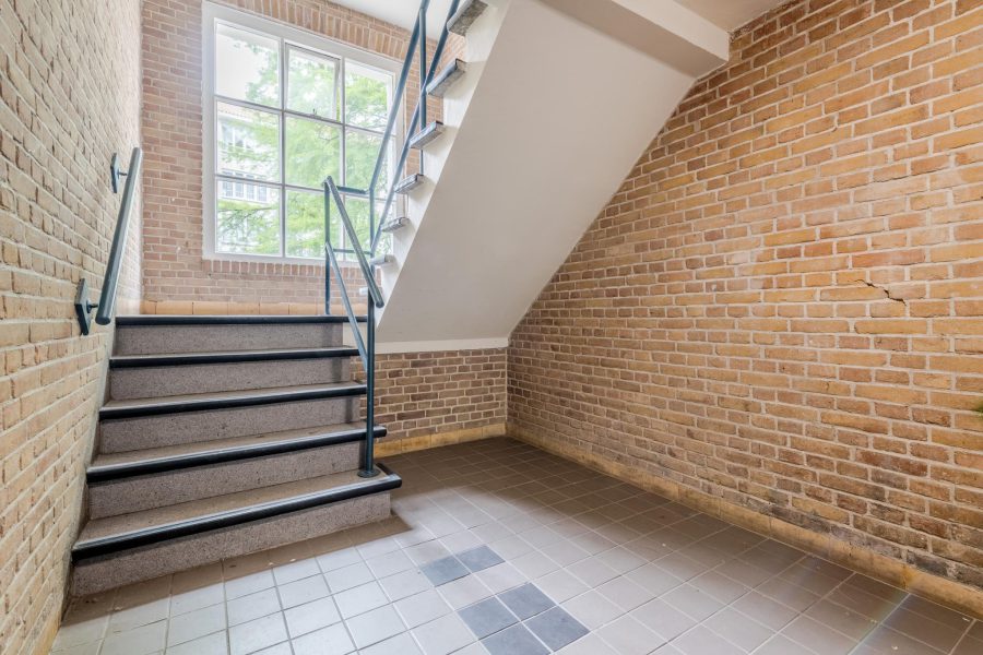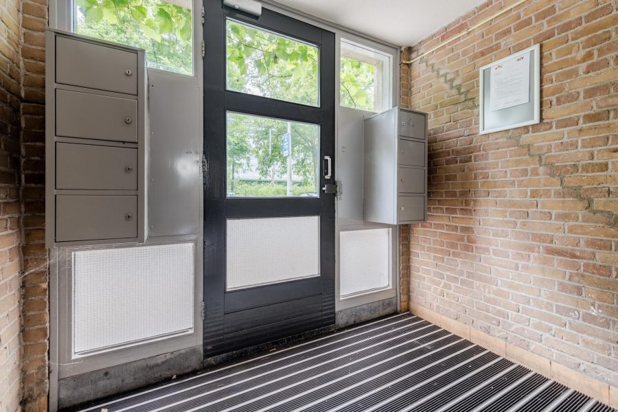 Via de brede stoep bereiken we de gesloten entree met bel en intercom. Gemeenschappelijke hal met trappenhuis. Met de trap bereiken we de 3e verdieping en de voordeur van de woning.