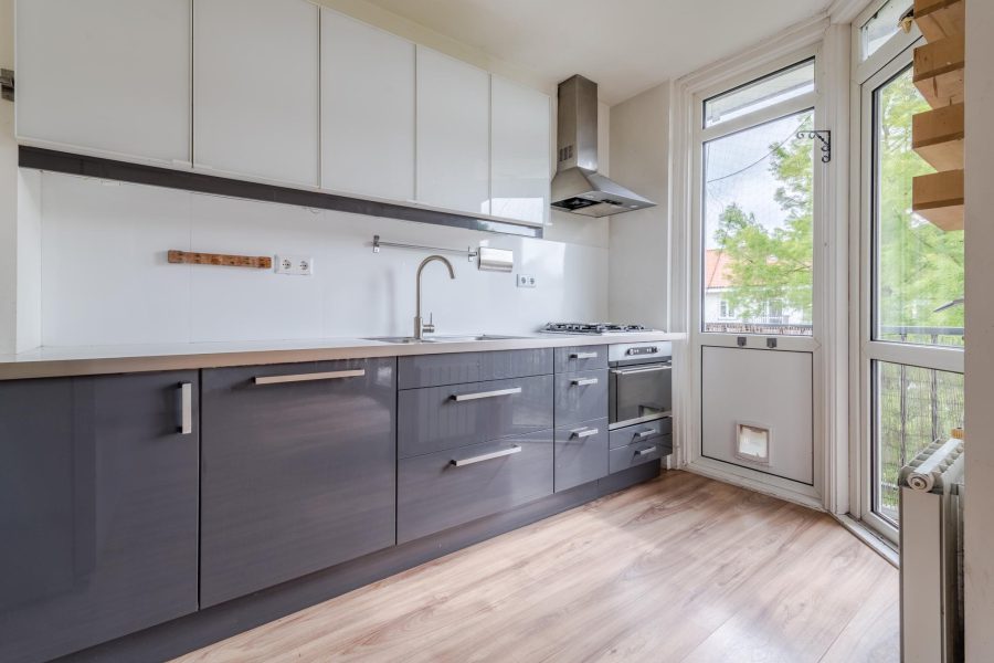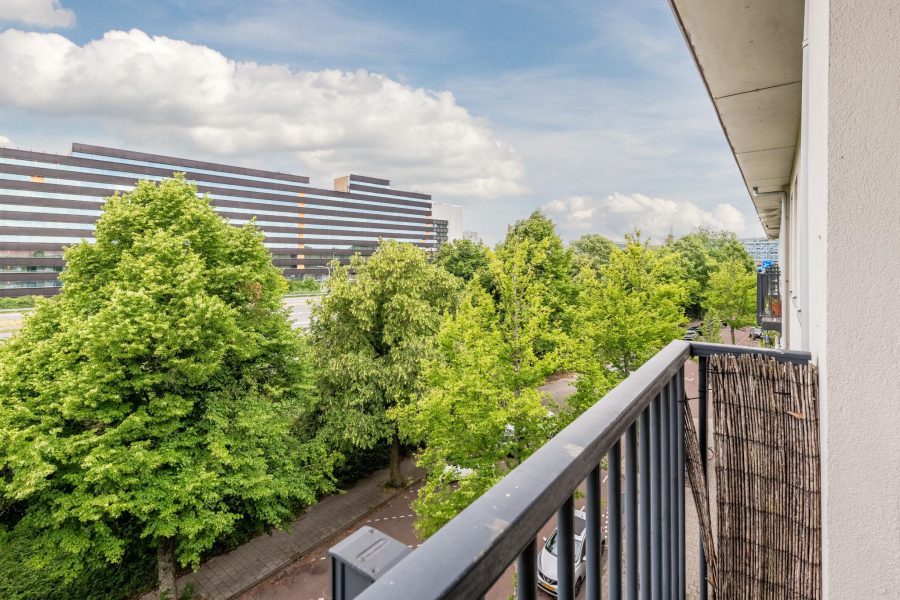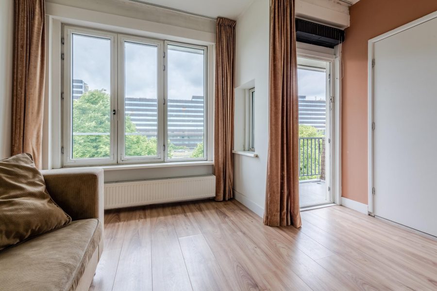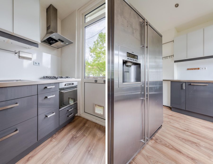 De woonkamer heeft aan de voorzijde een brede raampartij en toegang tot het balkon met vrij uitzicht. Aan de achterzijde heeft de woonkamer openslaande deuren naar het balkon. Aan de achterzijde tref je ook de keuken aan. De rechte keuken heeft grijze en witte fronten en is voorzien van diverse inbouwapparatuur en je treft er een Amerikaanse koelkast aan. Ook de keuken heeft toegang tot het balkon. Op het balkon met vrij uitzicht kun je een kleine loungeplek realiseren. In het gehele appartement ligt drempelloos laminaat en de muren en plafonds zijn strak en neutraal afgewerkt.